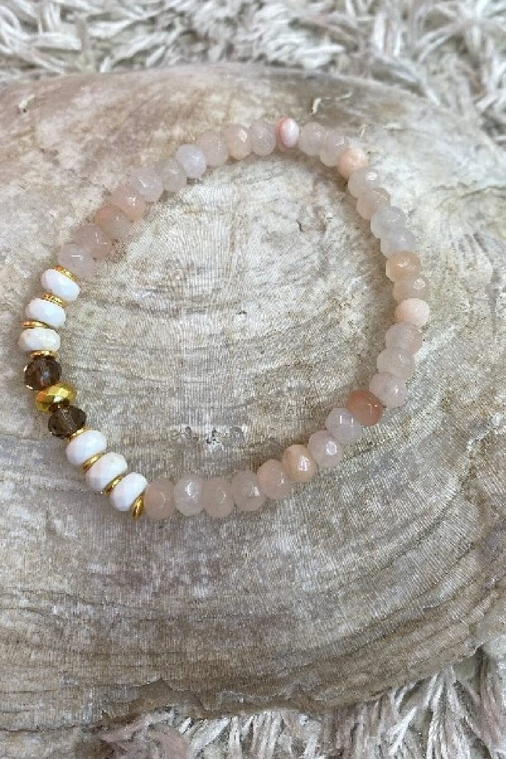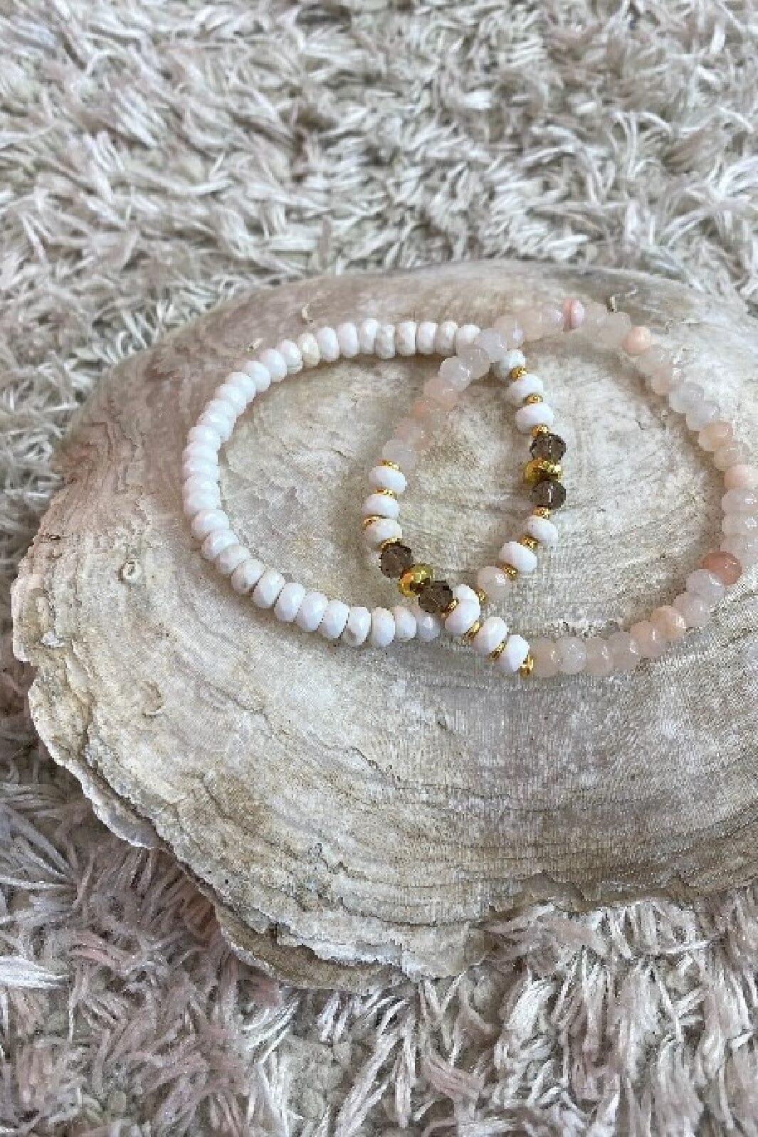 Un bracelet en perles de Friihof+Siig avec des perles en crème, rose et blanc. Les détails dorés entre les perles créent un contraste avec les couleurs claires.