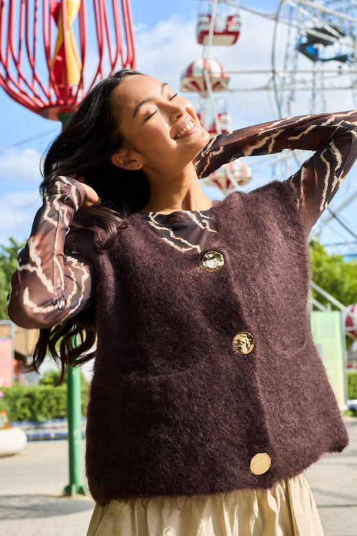 La veste en maille s'adapte à chaque moment de la journée. Elle se marie parfaitement avec les pullovers en maille pour un look casual, ou avec les robes en maille pour une tenue plus habillée. Les teintes neutres facilitent les associations quotidiennes.