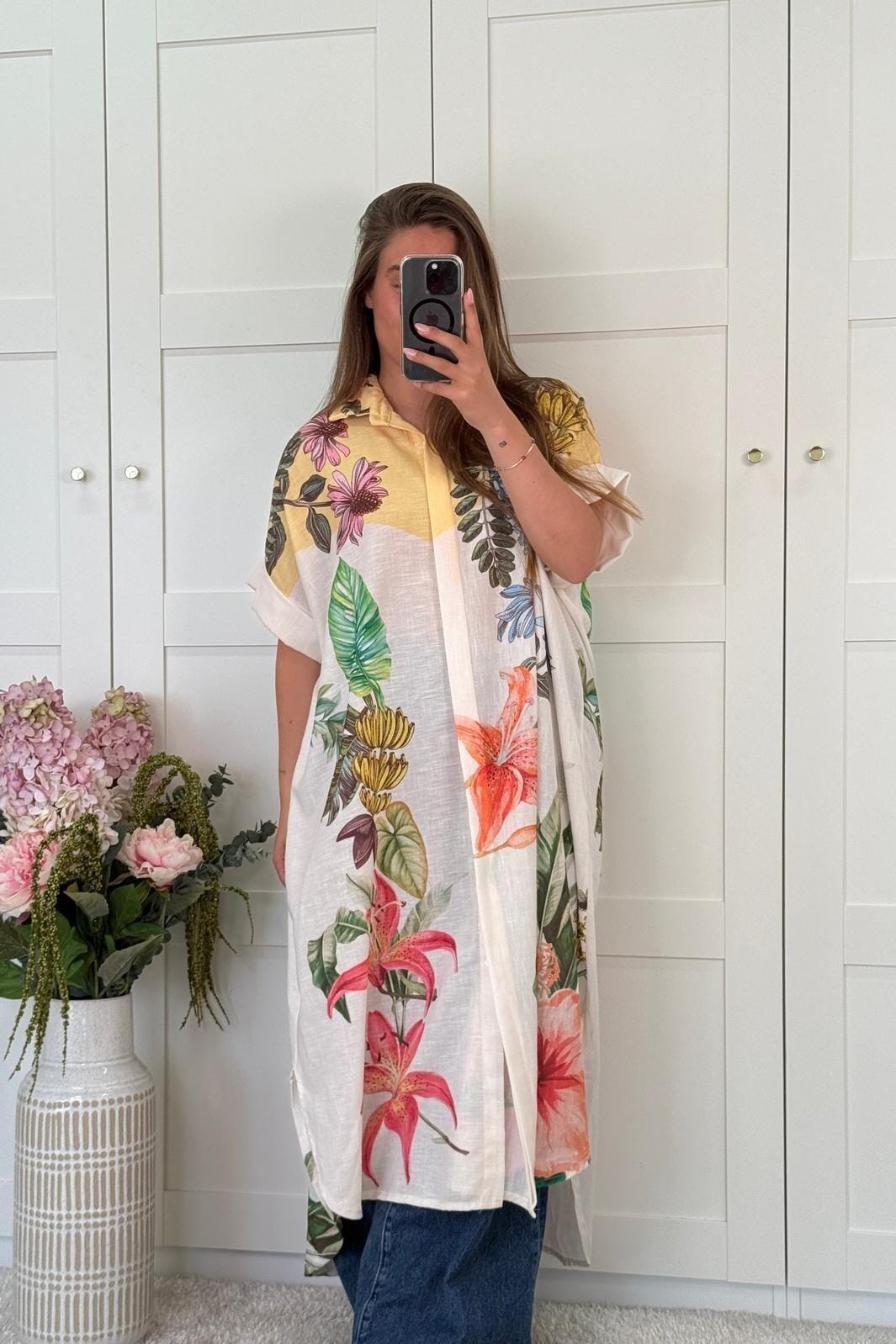 Chemise longue d'A-bee avec imprimé floral coloré. Le fond blanc est décoré de fleurs jaunes, roses et orange ainsi que de feuilles vertes. La chemise a un col classique et des boutons sur toute la longueur.