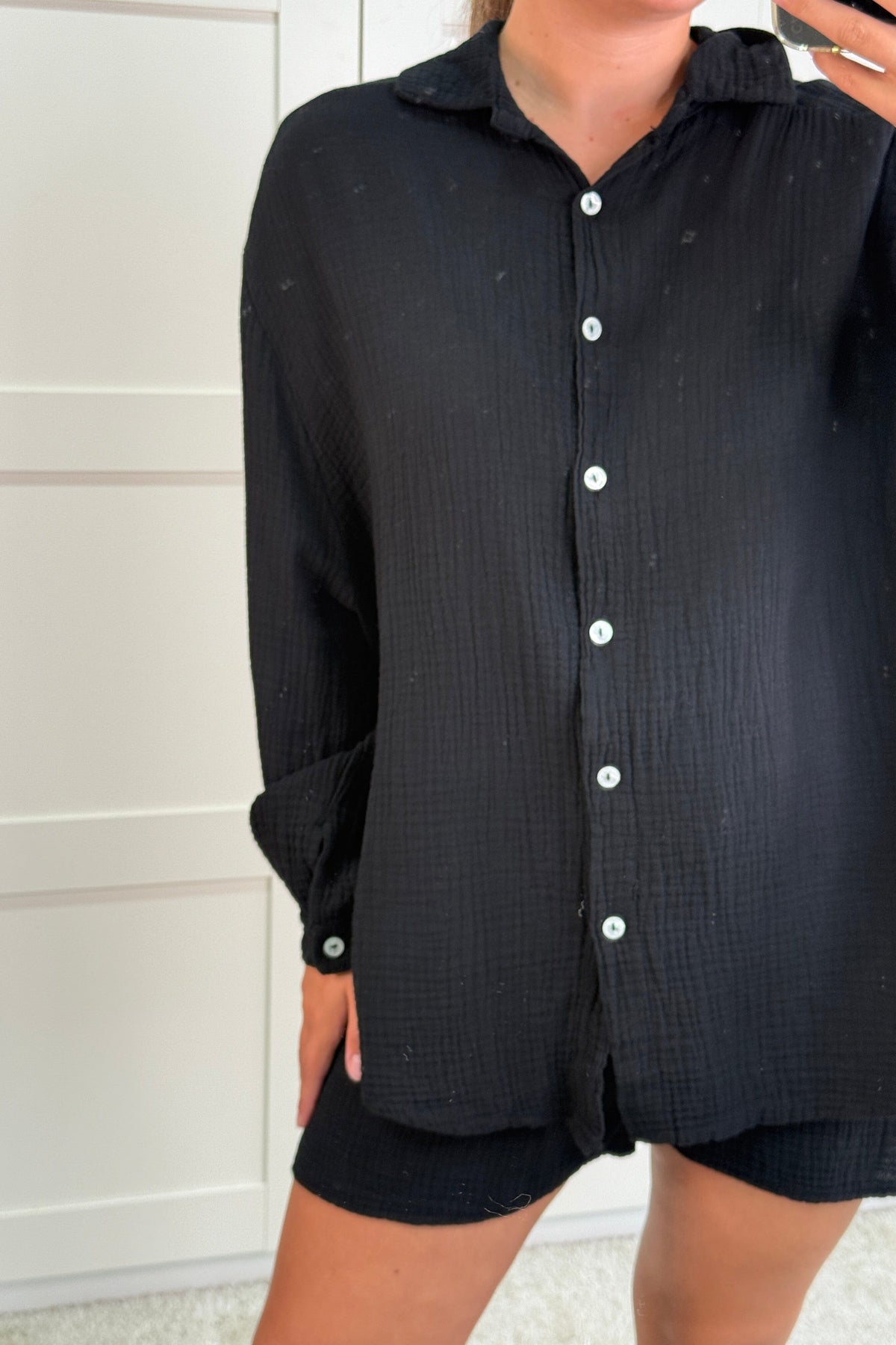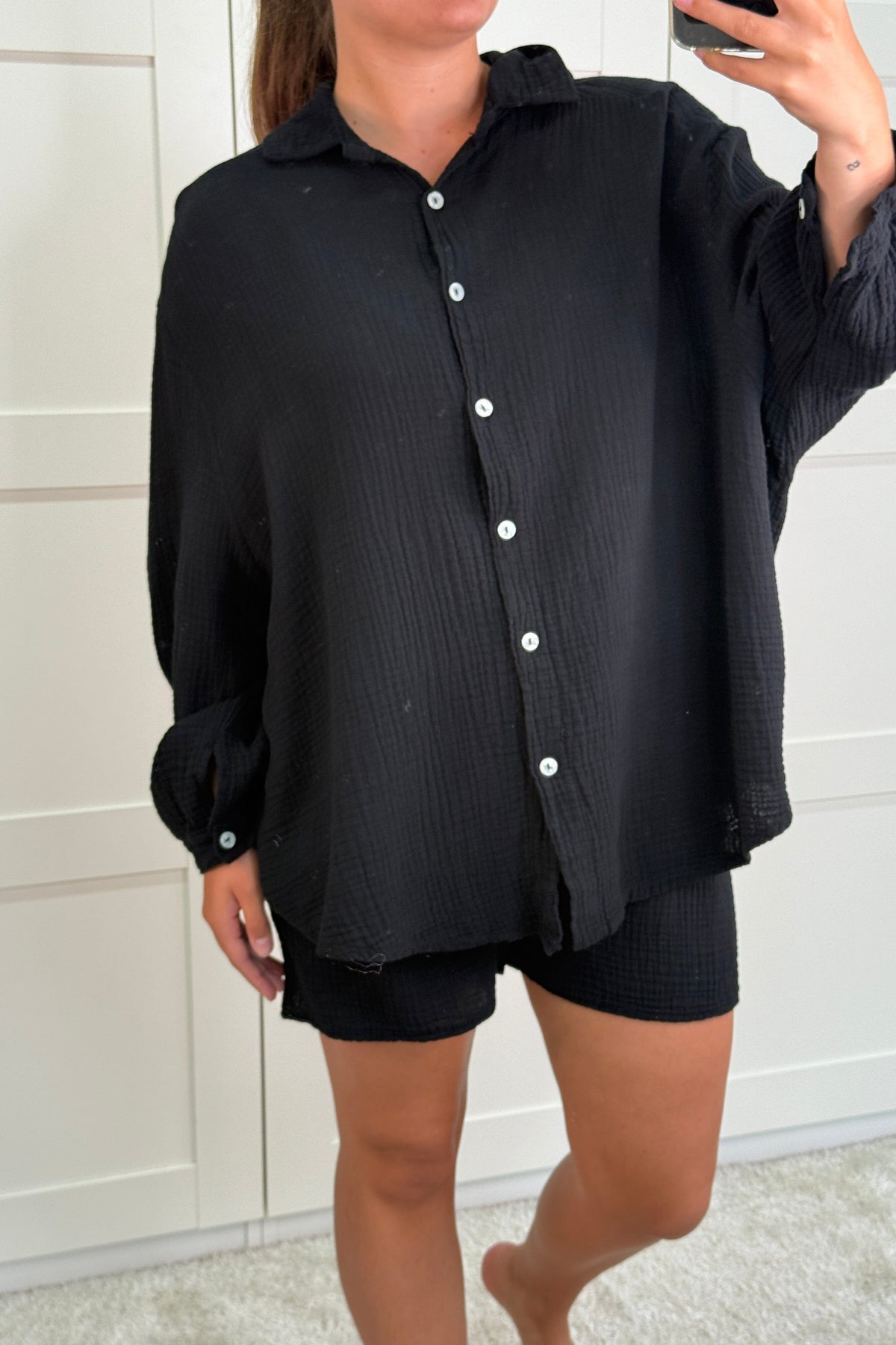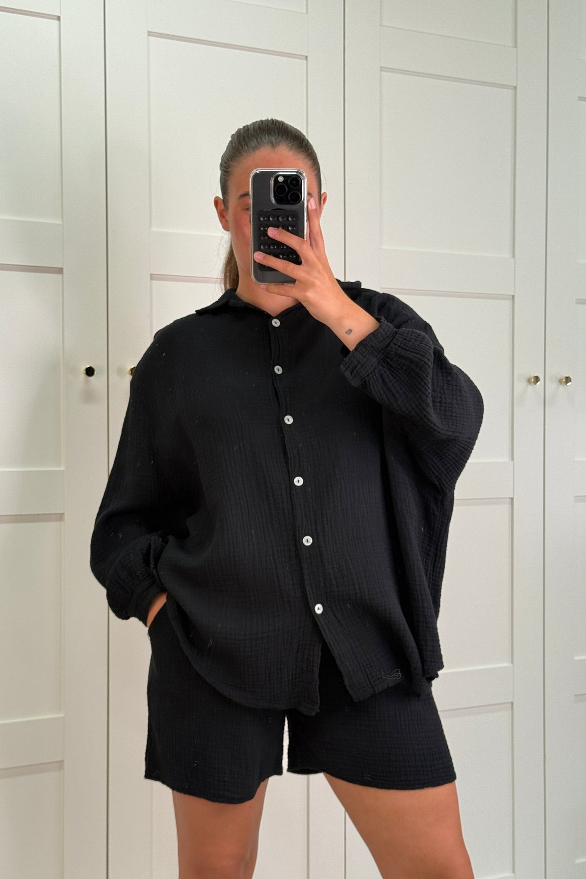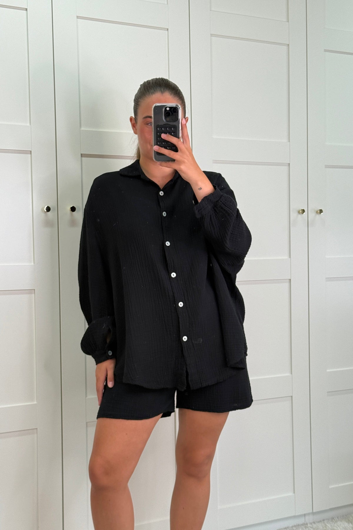 Ensemble noir de A-bee en deux pièces avec chemise et shorts. Fabriqué en pur coton avec des boutons à l'avant de la chemise et un cordon dans les shorts. L'ensemble a une coupe décontractée.