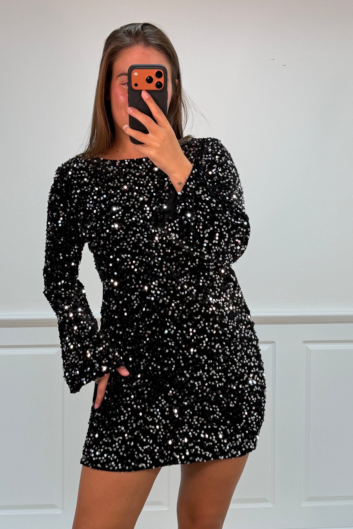 Robe de fête de A-bee avec des paillettes scintillantes et des détails en nœud. La robe a une base noire avec un motif argenté et des manches longues. L'encolure ronde et le nœud dans le dos donnent à la robe une touche festive.