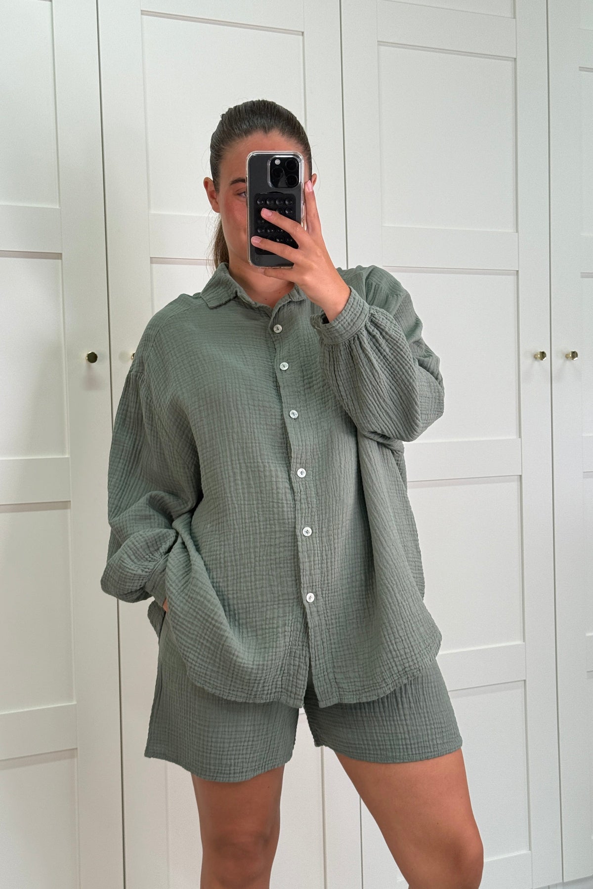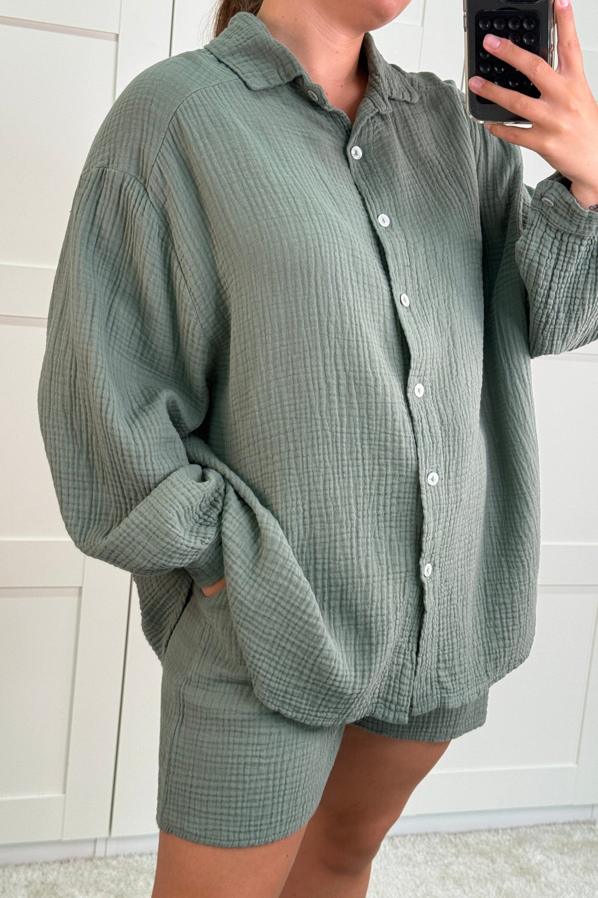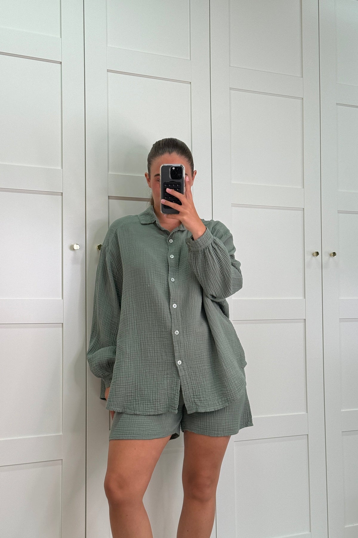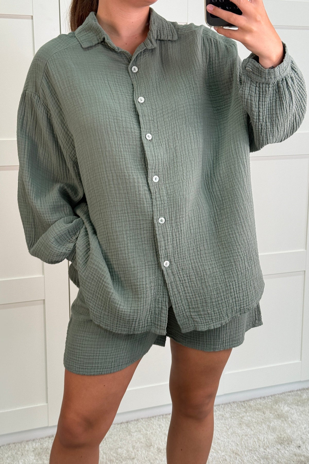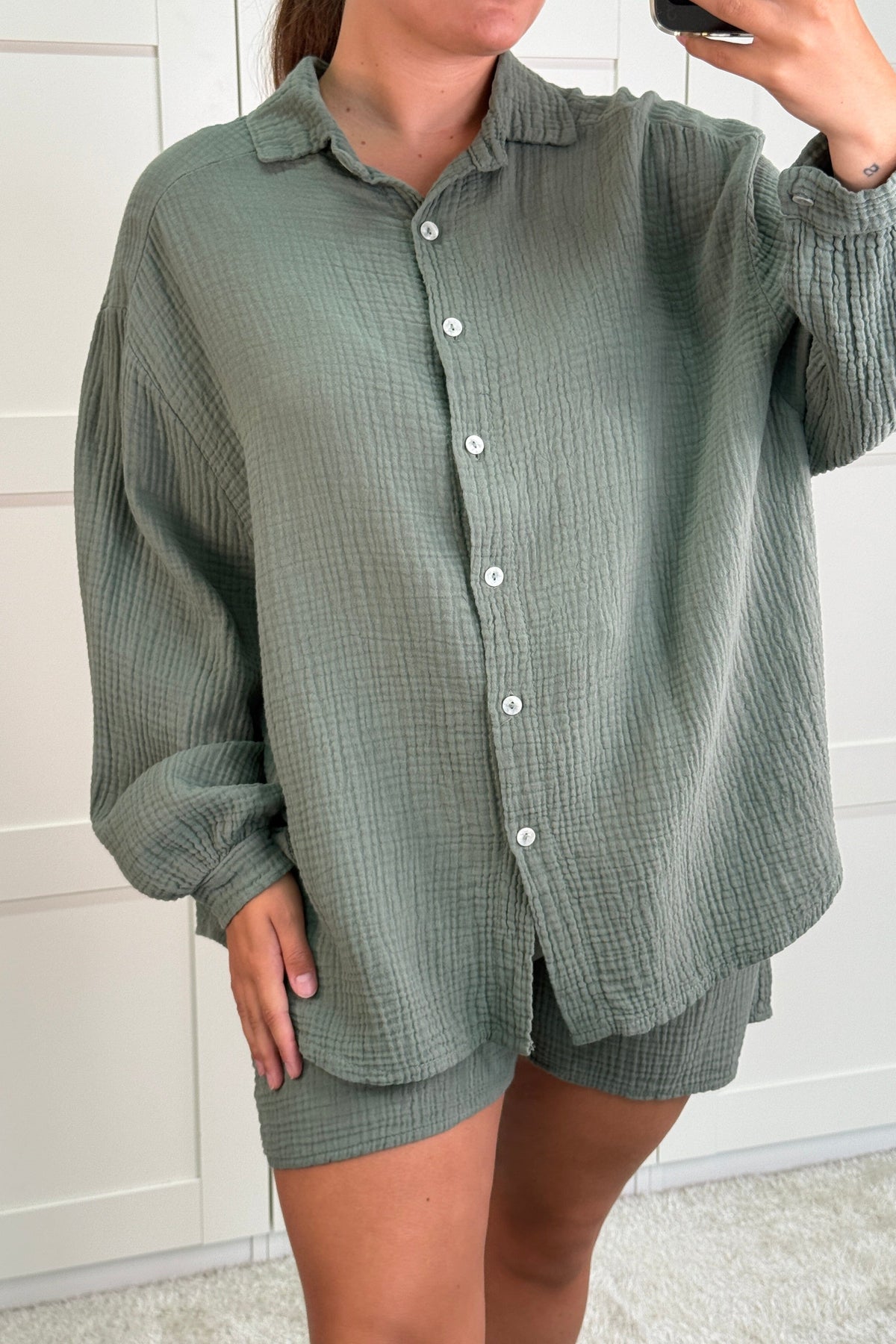 Chemise kaki de A-bee en coton léger. La chemise a des boutons sur toute la longueur et un lien à la taille. La nuance de vert s'accorde bien avec des couleurs claires et foncées.