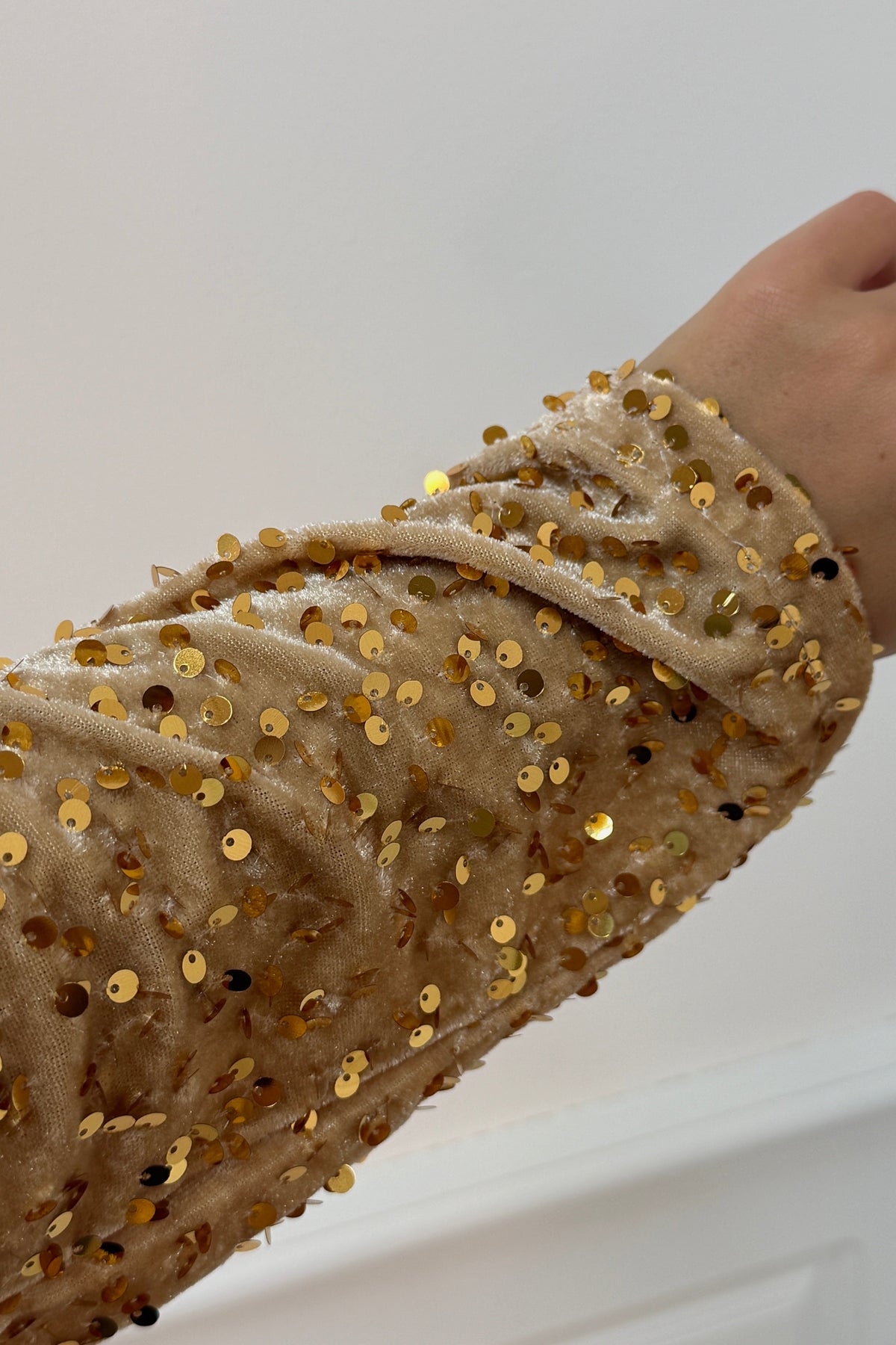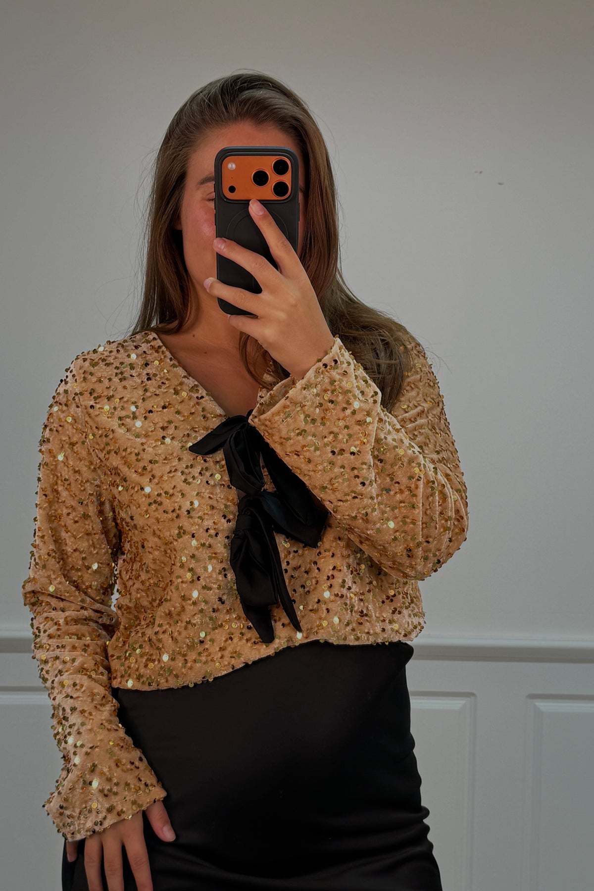 Blouse dorée d'A-bee avec des paillettes sur toute la surface. Elle a des manches longues, un décolleté en V et des détails en nœud noir au niveau du cou.