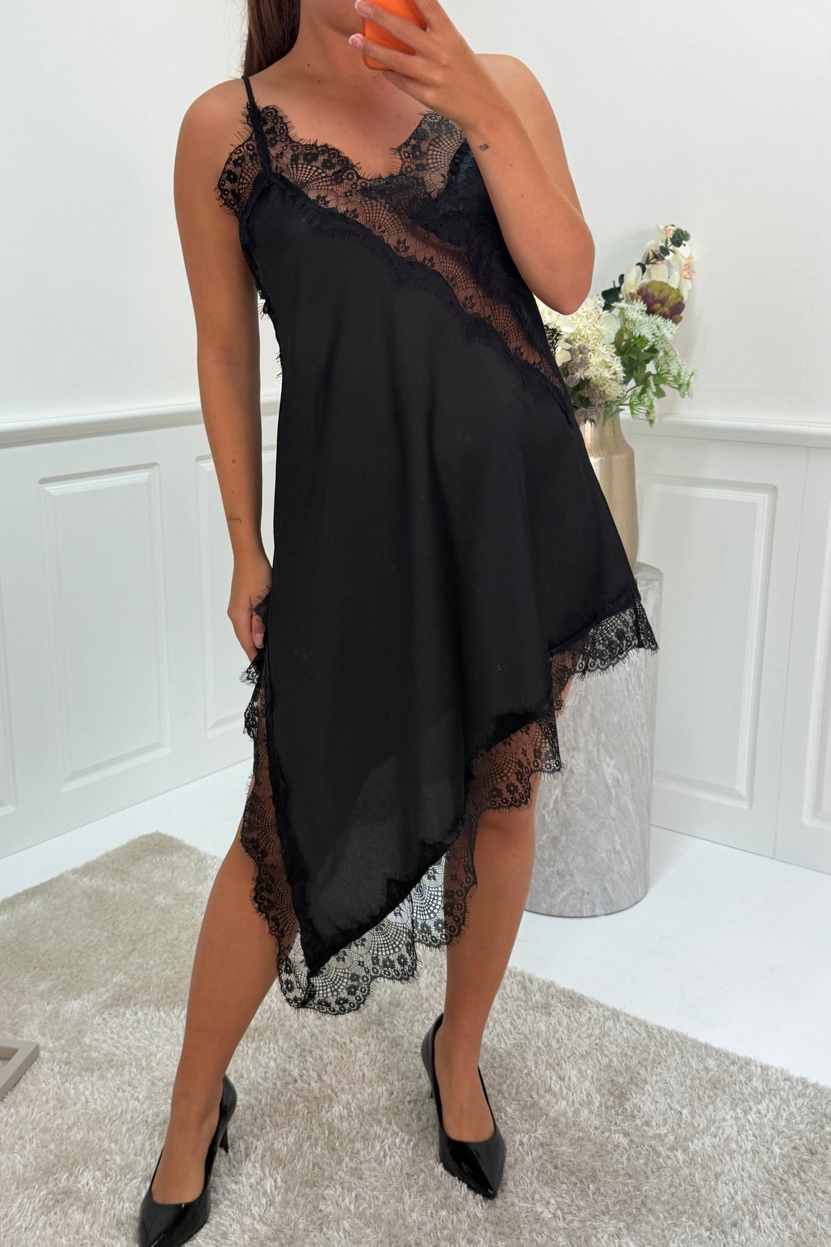 Robe de fête noire d'A-bee avec décolleté en V et ourlet asymétrique. La robe a des détails en dentelle le long de l'encolure et de l'ourlet, ce qui donne une belle expression au design.