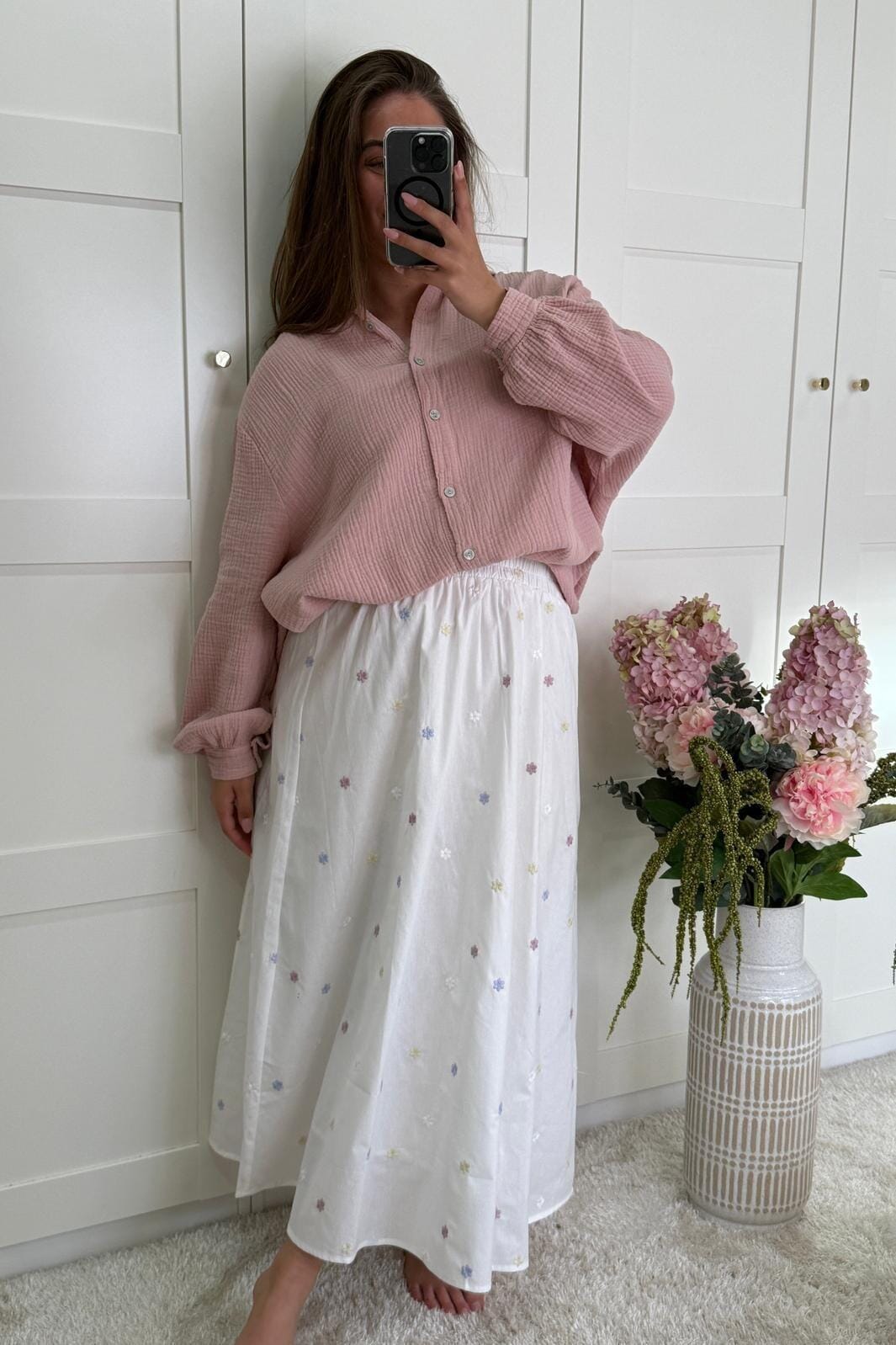 Jupe blanche d'A-bee avec des fleurs brodées en violet, jaune et rose. Elle a une coupe ample et une longueur genou qui la rend utilisable aussi bien pour le quotidien que pour les fêtes.