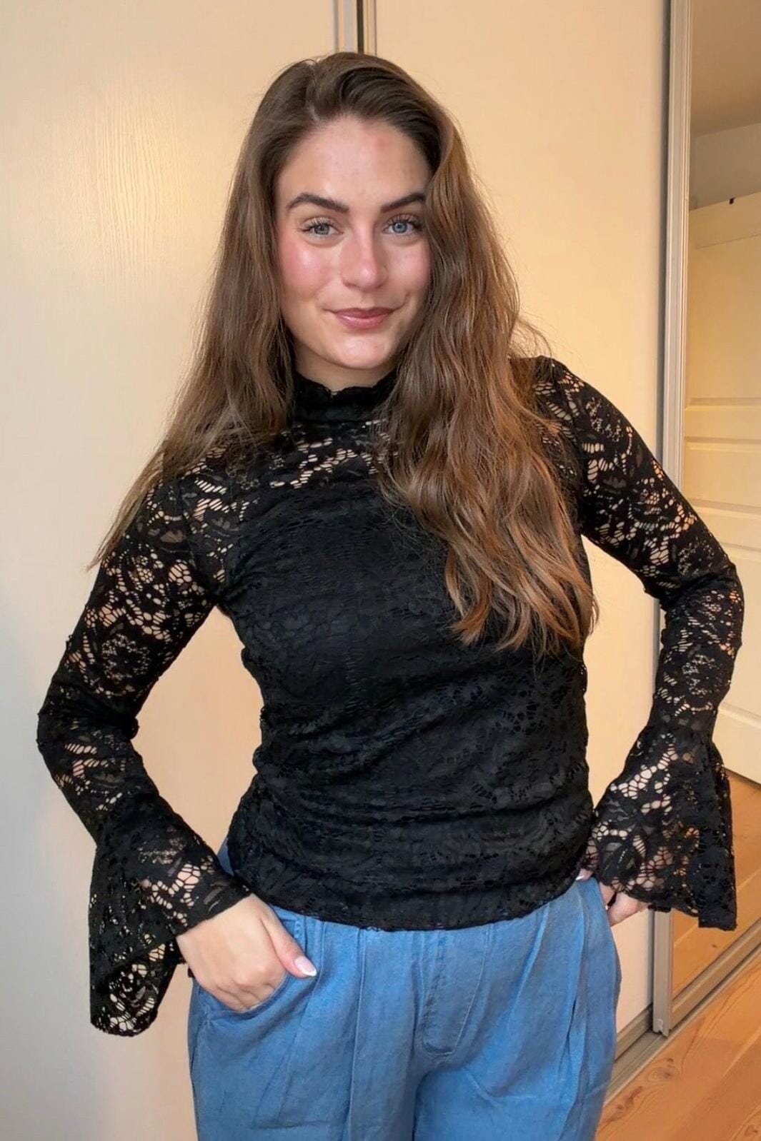 Blouse noire de A-bee, en polyamide et élasthanne. La blouse présente de la dentelle et des volants dans le tissu.