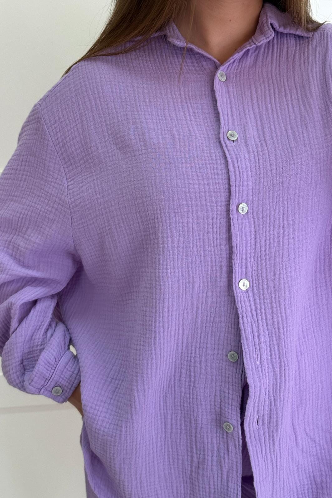 Chemise de A-bee en coton lilas clair avec fermeture à boutons à l'avant. Elle a un col plié et des manches amples qui offrent une bonne liberté de mouvement.