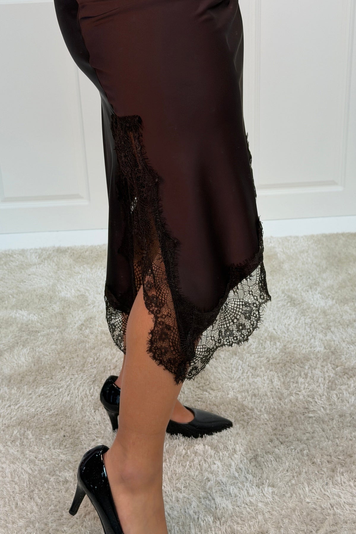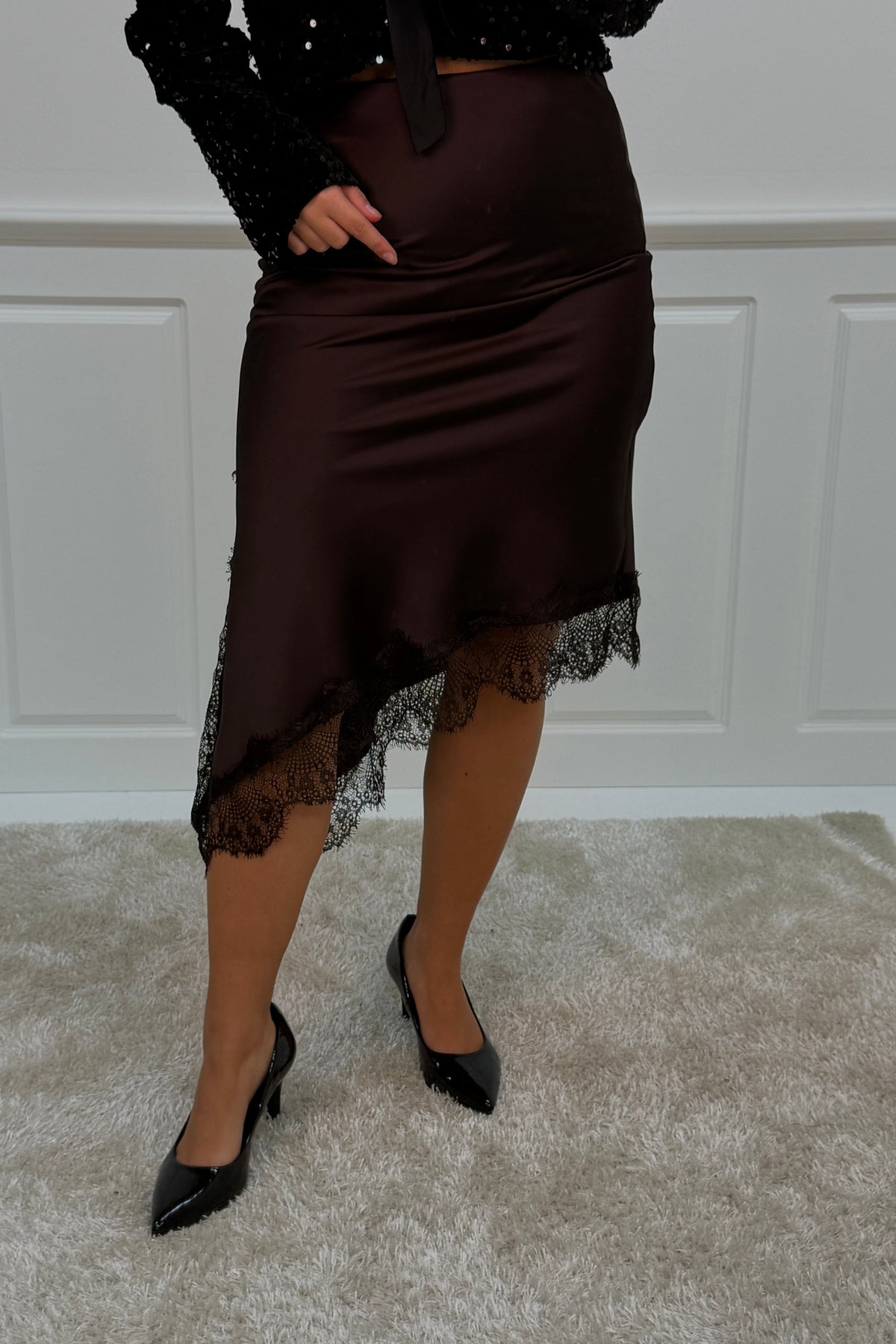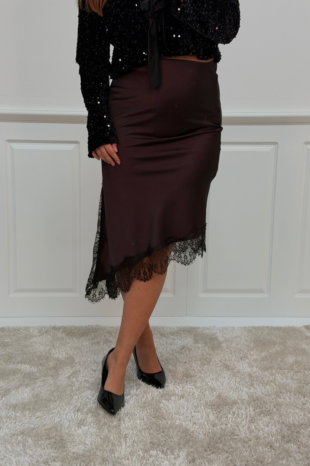 Jupe brune d'A-bee avec des détails en dentelle le long du bord. La jupe est fabriquée en viscose et a une longueur jusqu'au mollet avec une taille normale.