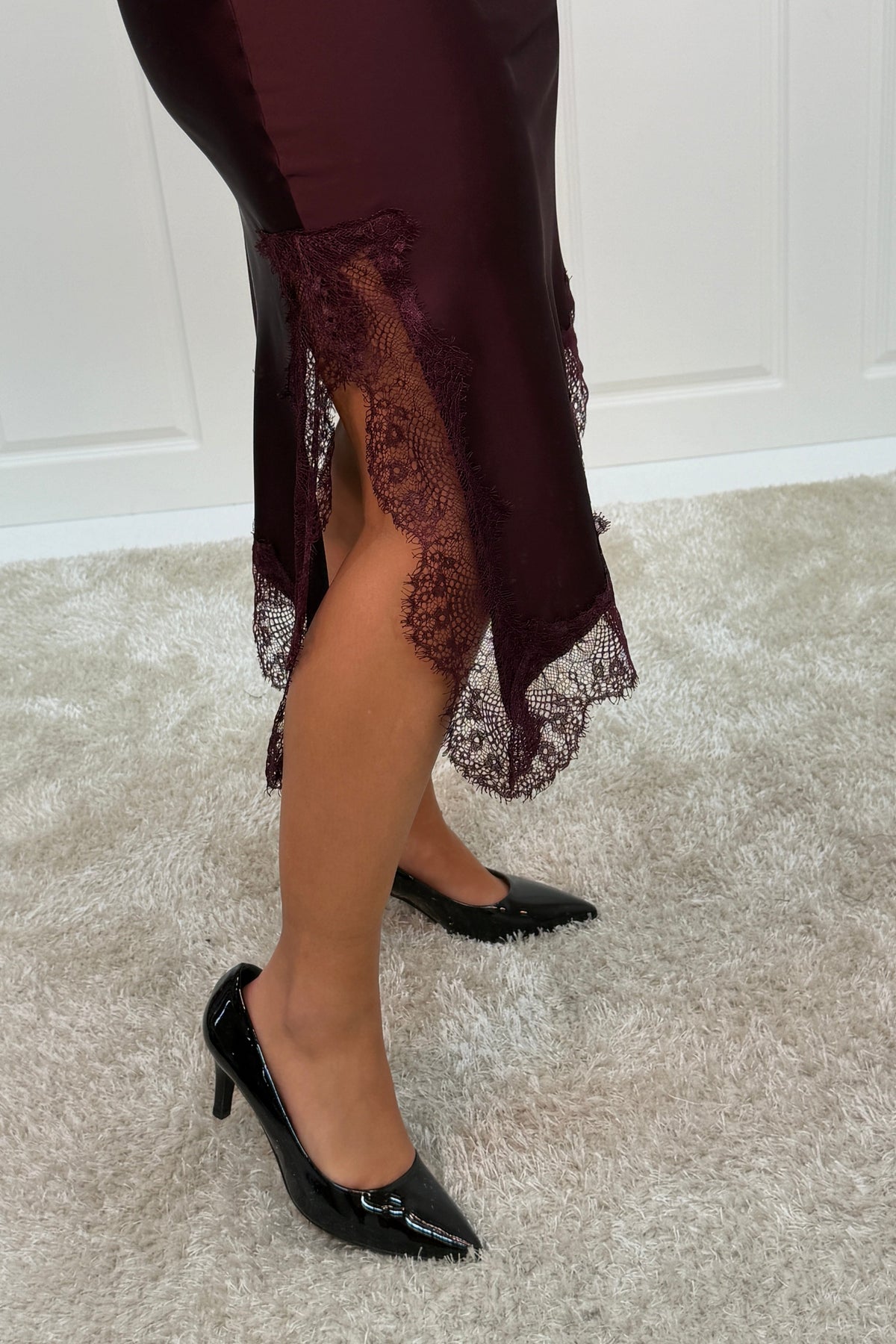 Jupe couleur prune d'A-bee avec des détails en dentelle le long du bord. La jupe a une longueur jusqu'au milieu du mollet et une surface lisse avec une finition brillante.