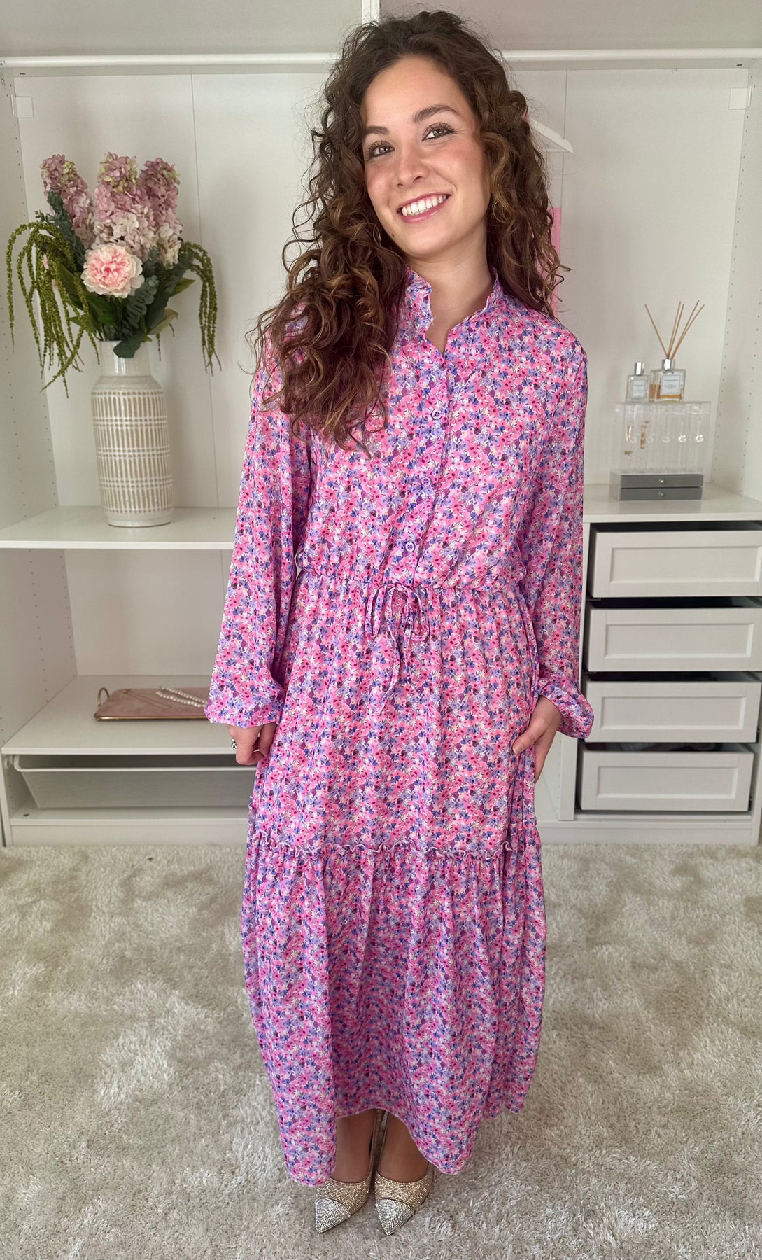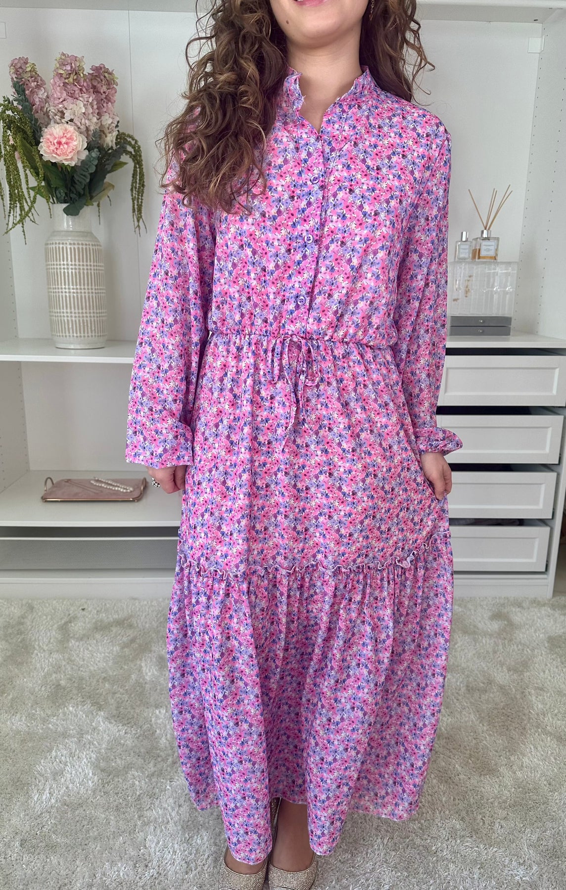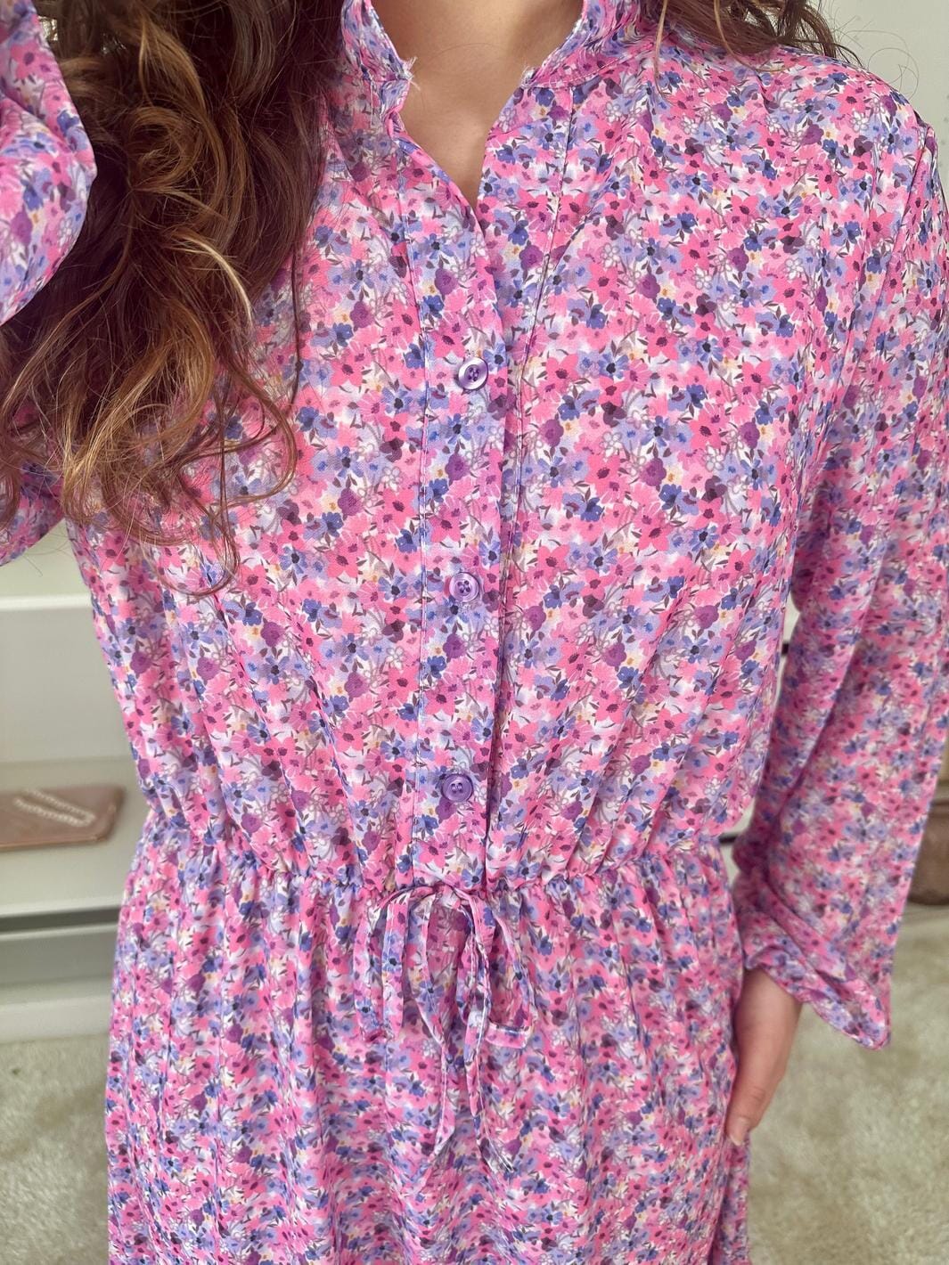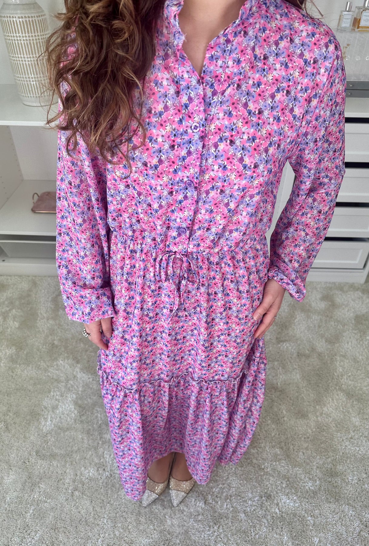 Robe longue de A-bee avec imprimé floral dans des nuances de rose et de violet. La robe a un col chemise, une fermeture à boutons à l'avant et des manches longues.