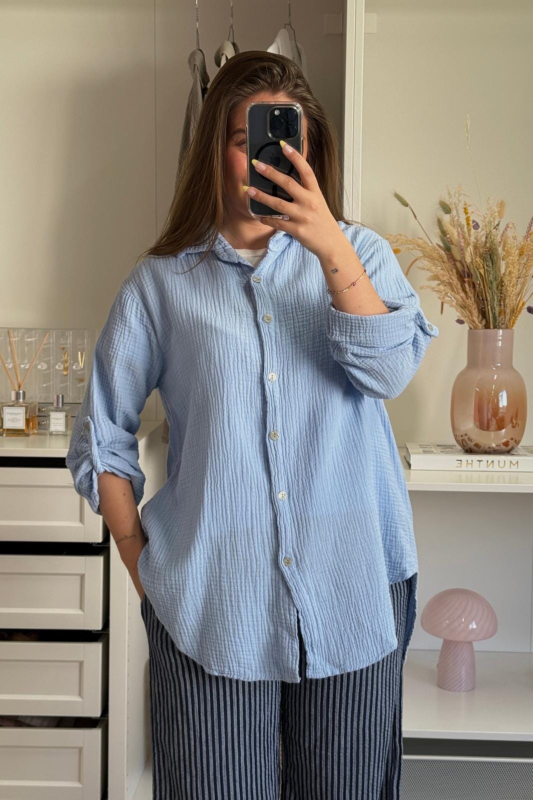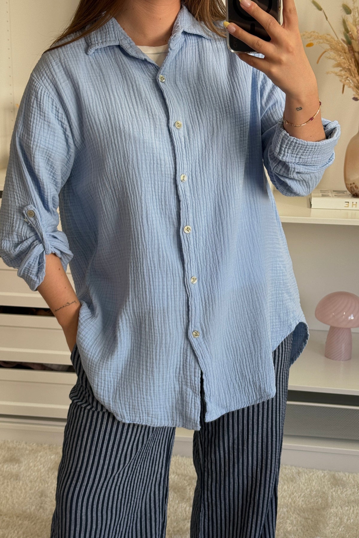 Chemise bleu ciel d'A-bee en coton froissé. Elle a un col de chemise et une fermeture à boutons à l'avant. Les manches peuvent être retroussées, et la chemise convient aussi bien pour le quotidien que pour les fêtes.