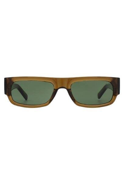 Lunettes de soleil de A. Kjærbede en brun transparent avec des verres verts. Les lunettes ont une forme rectangulaire et sont fabriquées à partir du matériau léger Tritan Renew.