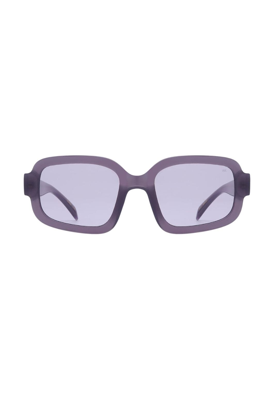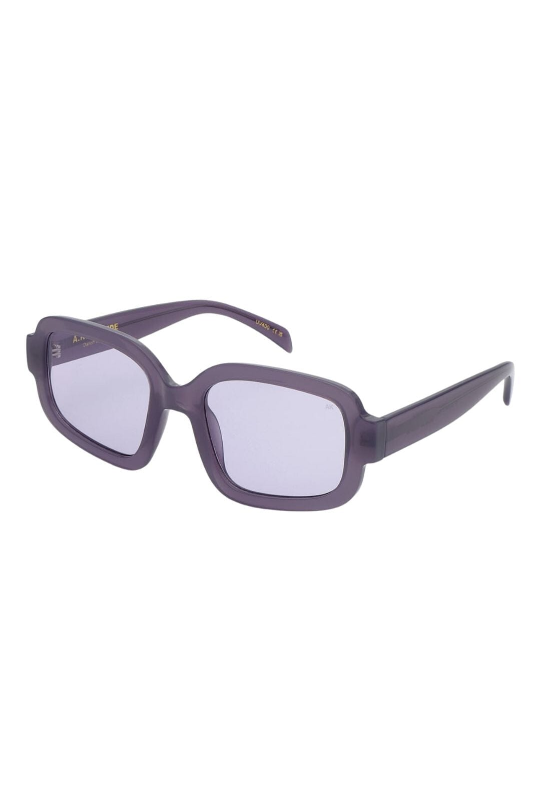Lunettes de soleil de A. Kjærbede avec une monture rectangulaire dans des nuances de violet. La monture a un cadre robuste avec des verres teintés et des courbes douces dans le design.