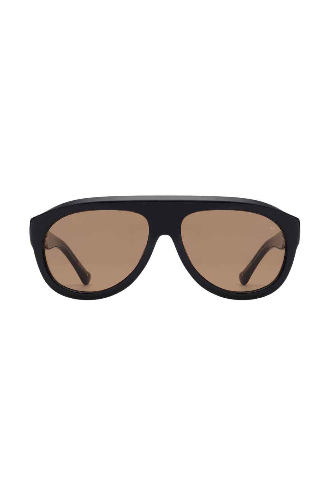 Lunettes de soleil noires de A. Kjærbede avec une monture inspirée des aviators. Les lunettes ont une forme large et sculptée avec des verres bruns et un pont marqué de 16 mm.