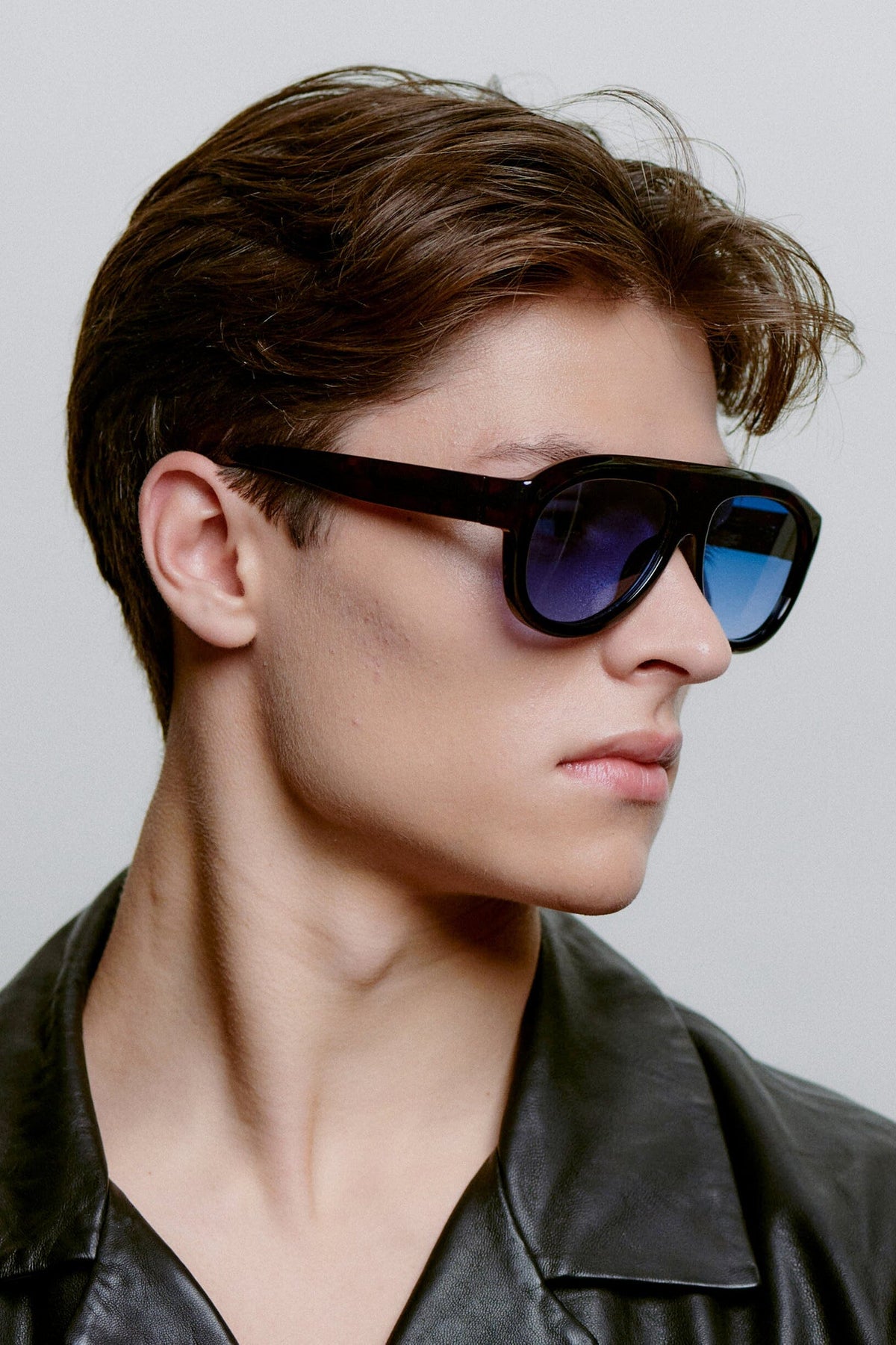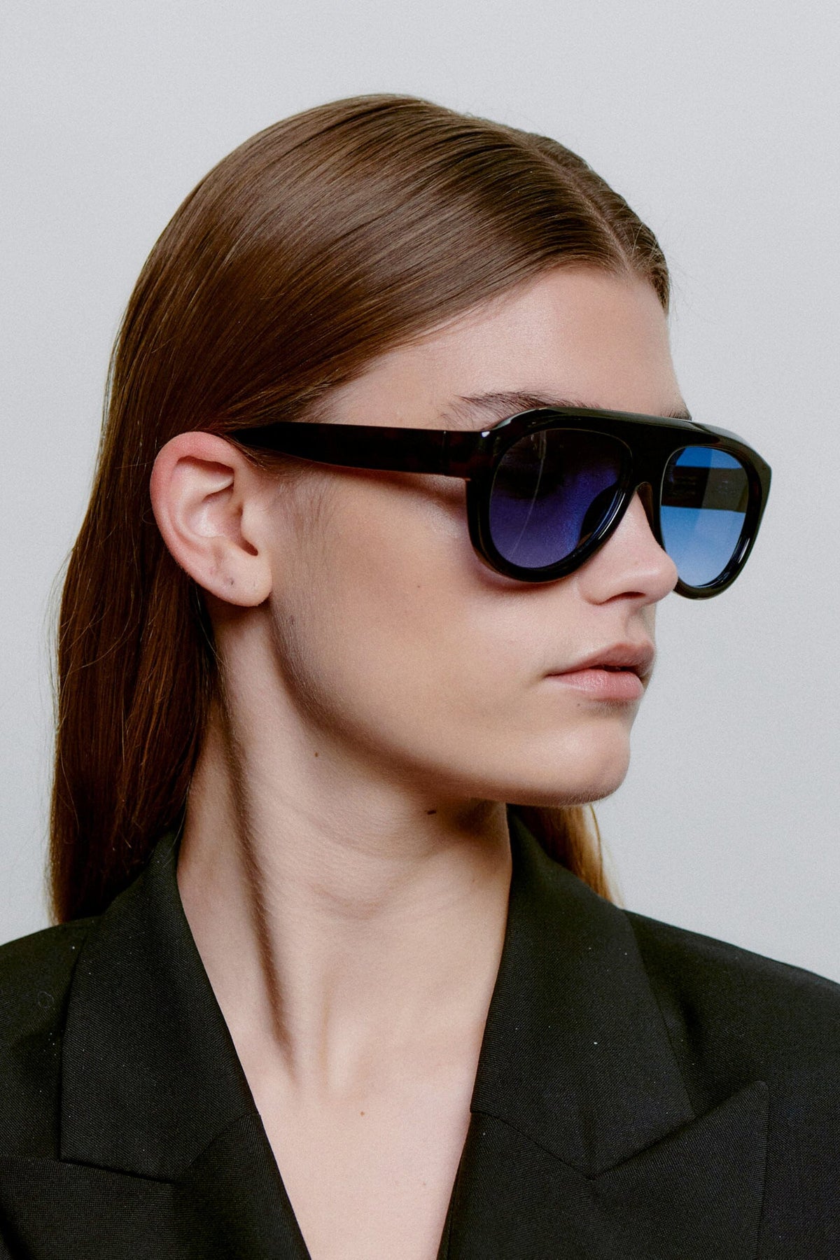 Lunettes de soleil de A. Kjærbede au design aviator avec une monture en demi tortoise brun et des verres teintés en bleu. La monture a une grande forme sculpturale avec des lignes marquées.