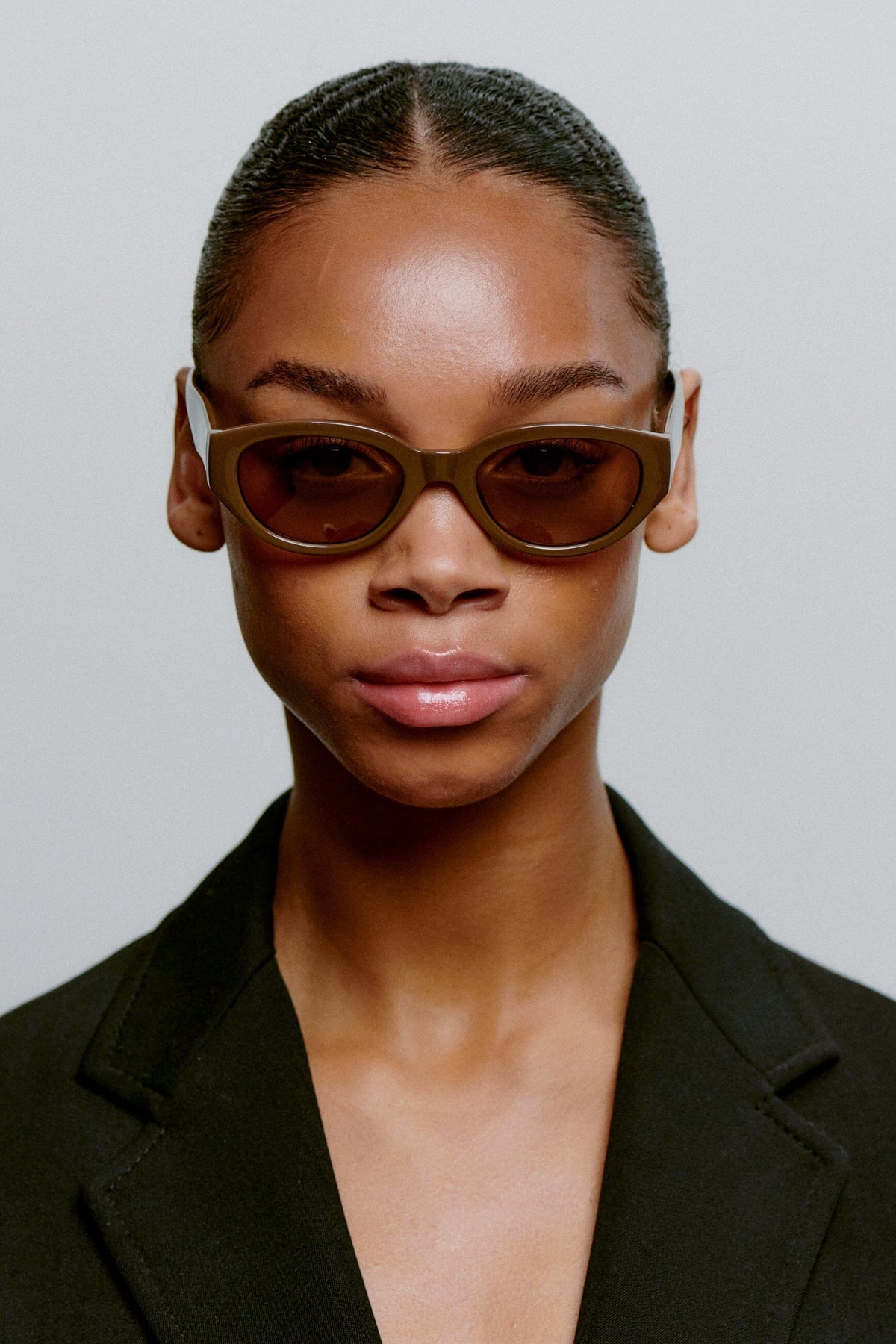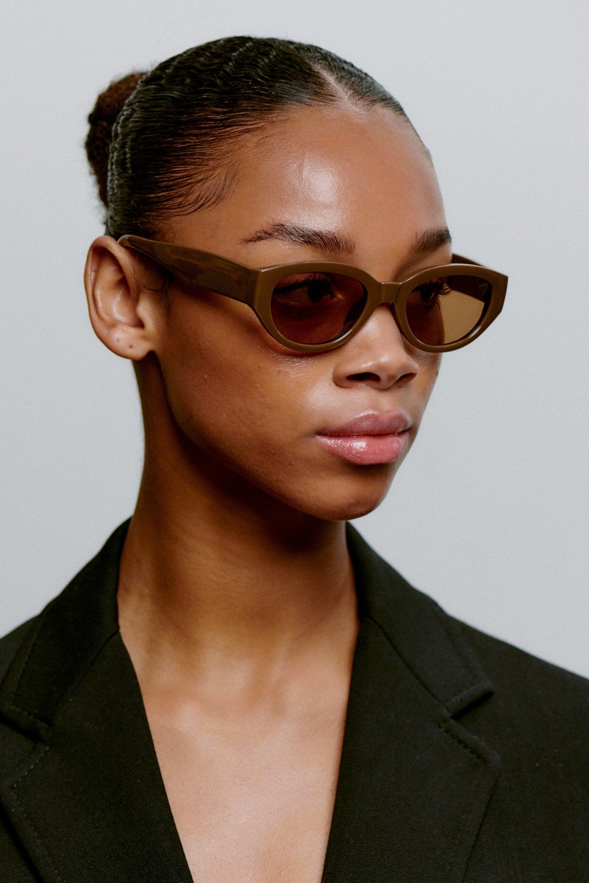 Des lunettes de soleil brunes de A. Kjærbede avec une forme cat-eye. La monture a un design épais en matériau Tritan Renew brun foncé avec des branches flexibles et des charnières optiques de haute qualité.
