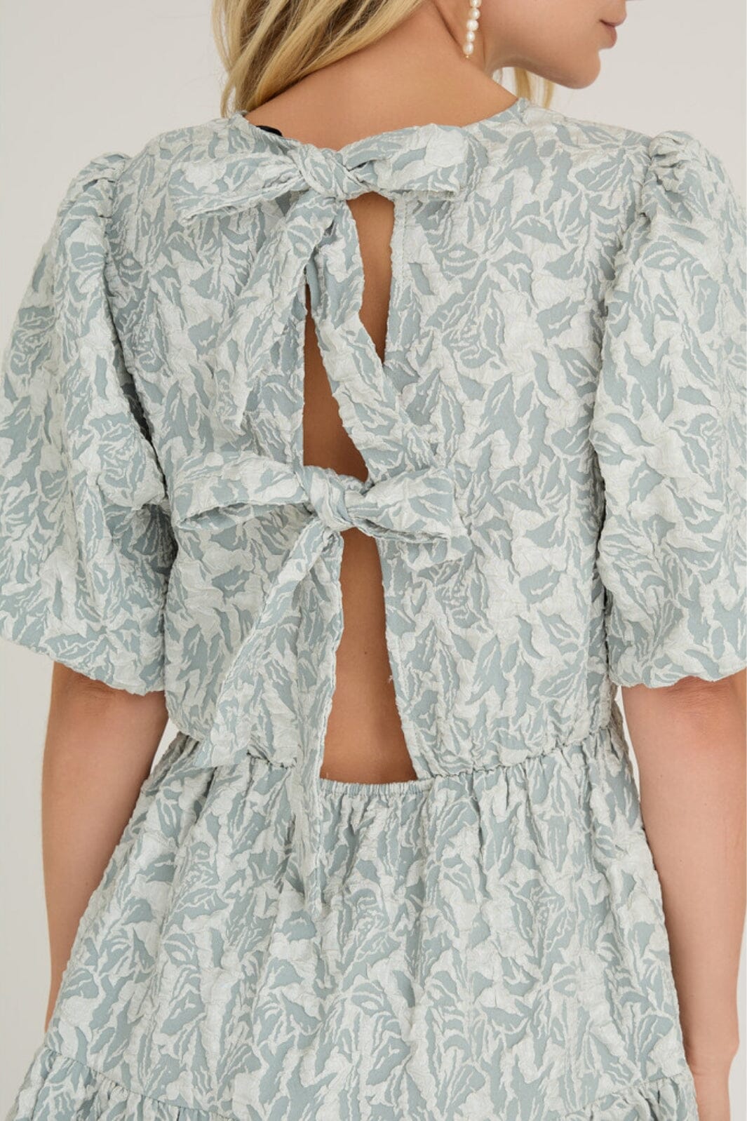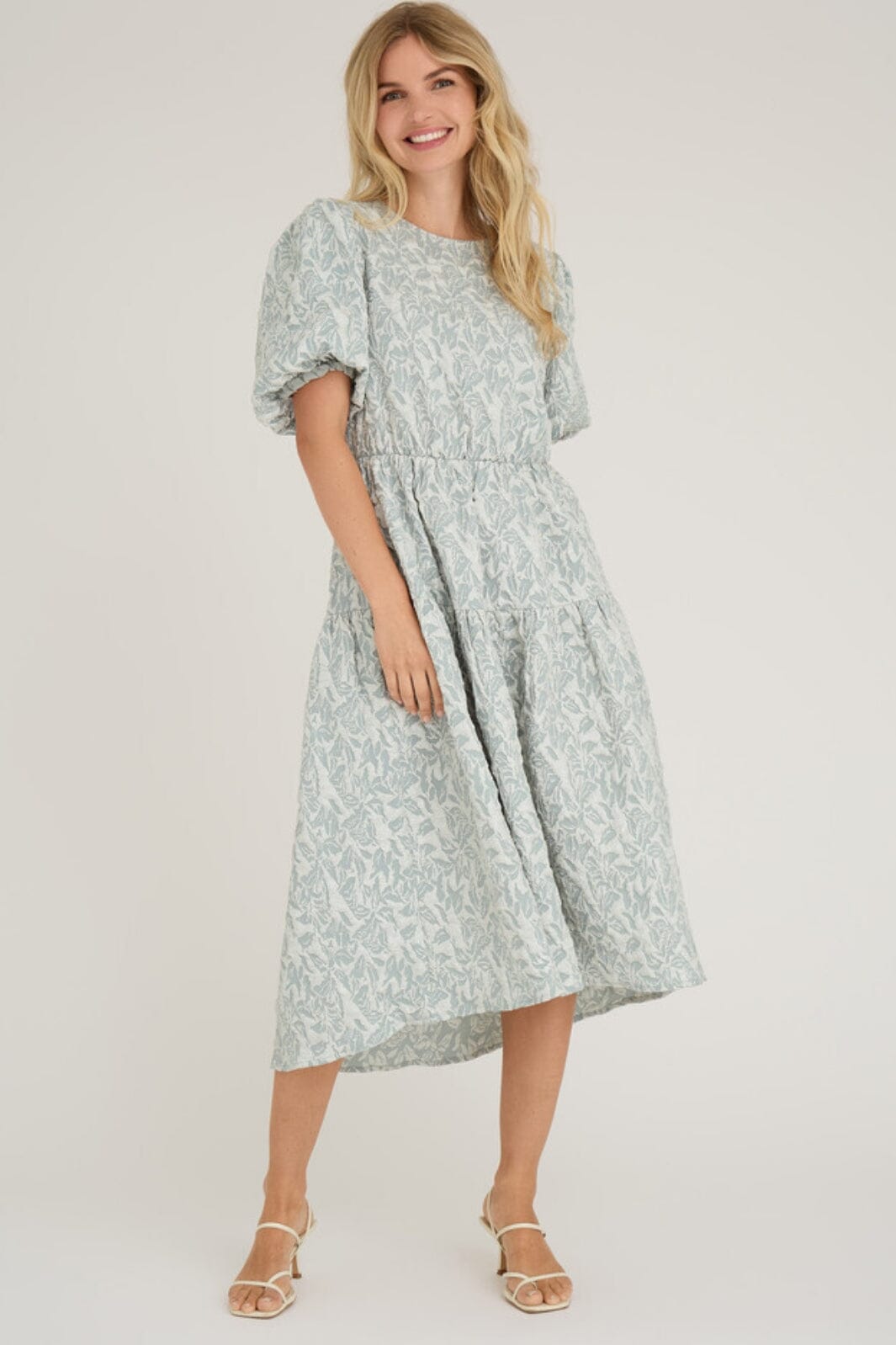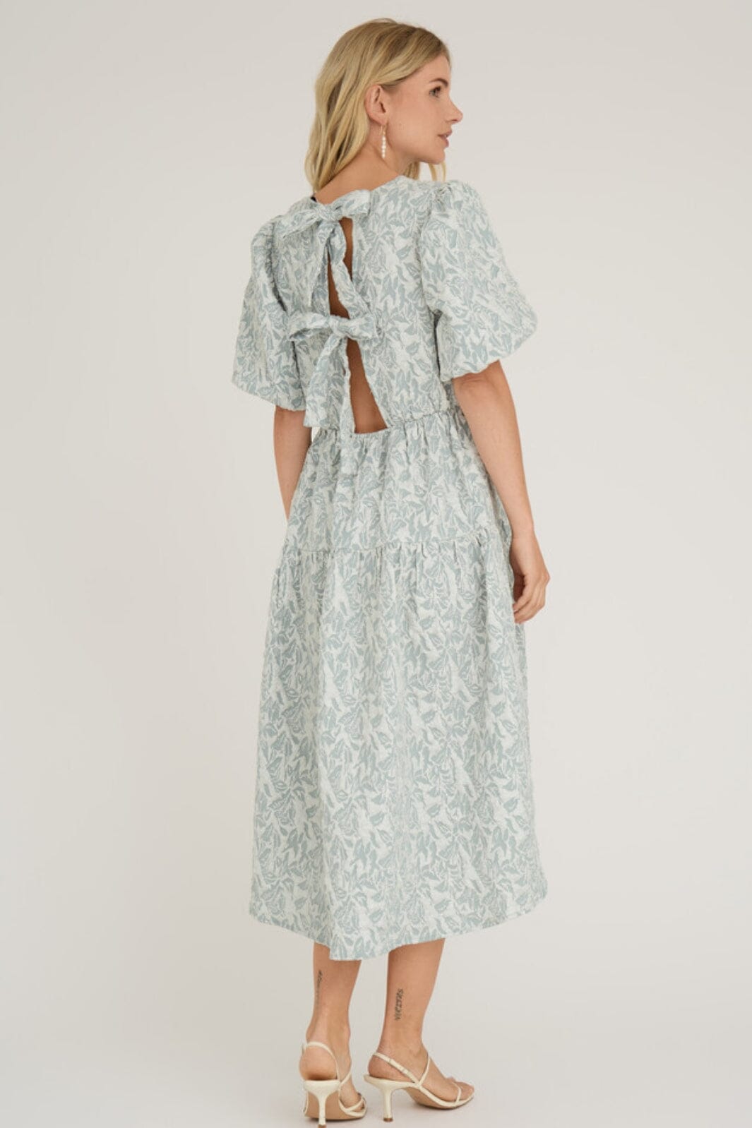 Robe vert menthe avec imprimé floral de A-View. Elle a des manches bouffantes et une jupe à plusieurs niveaux avec effet peplum. Le dos a une découpe ouverte avec un lien à nouer.