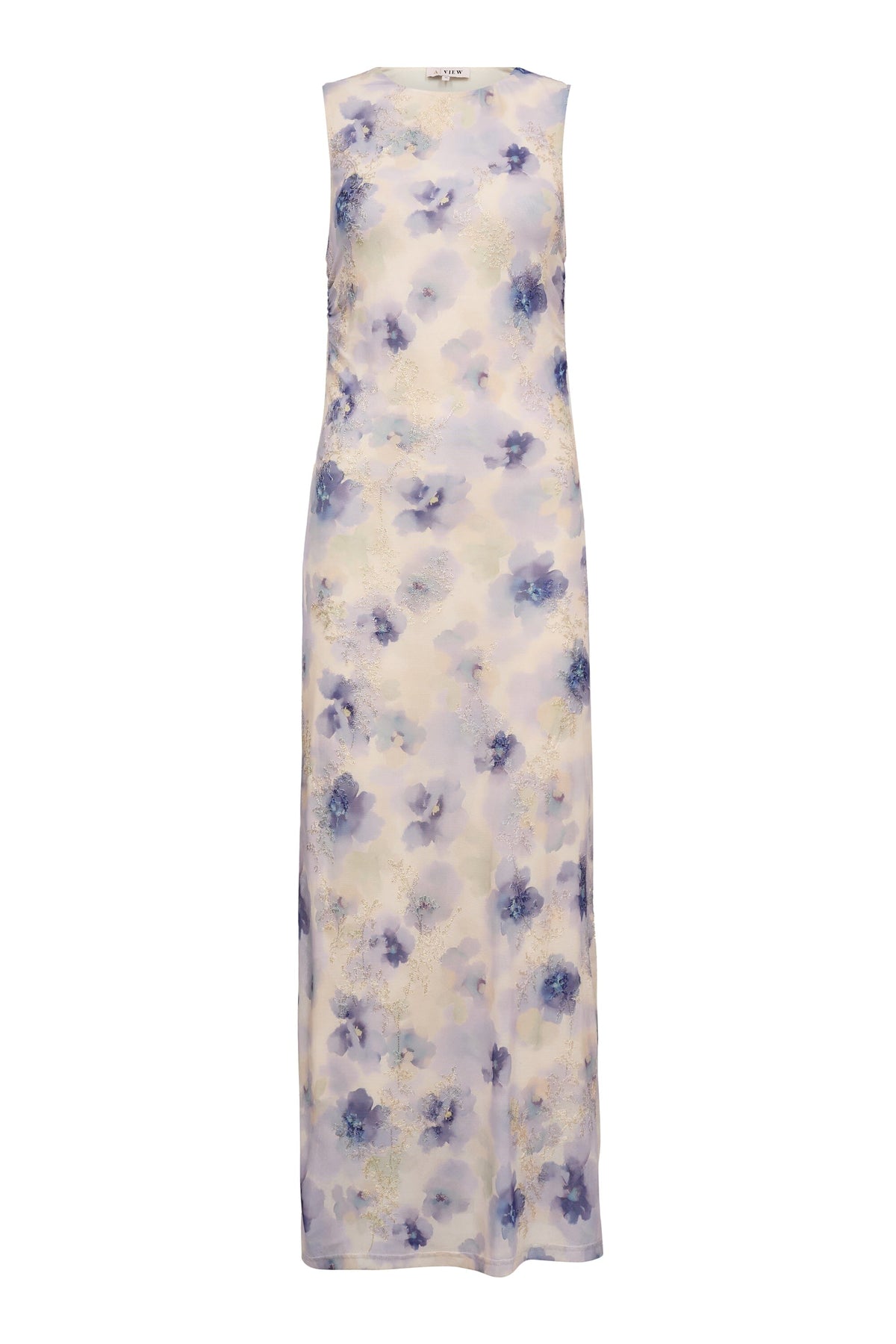 Robe sans manches de A-View avec imprimé fleuri violet et jaune. La robe est confectionnée dans une matière en mesh et a une longueur juste au-dessus du genou.