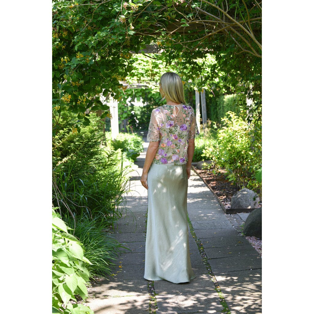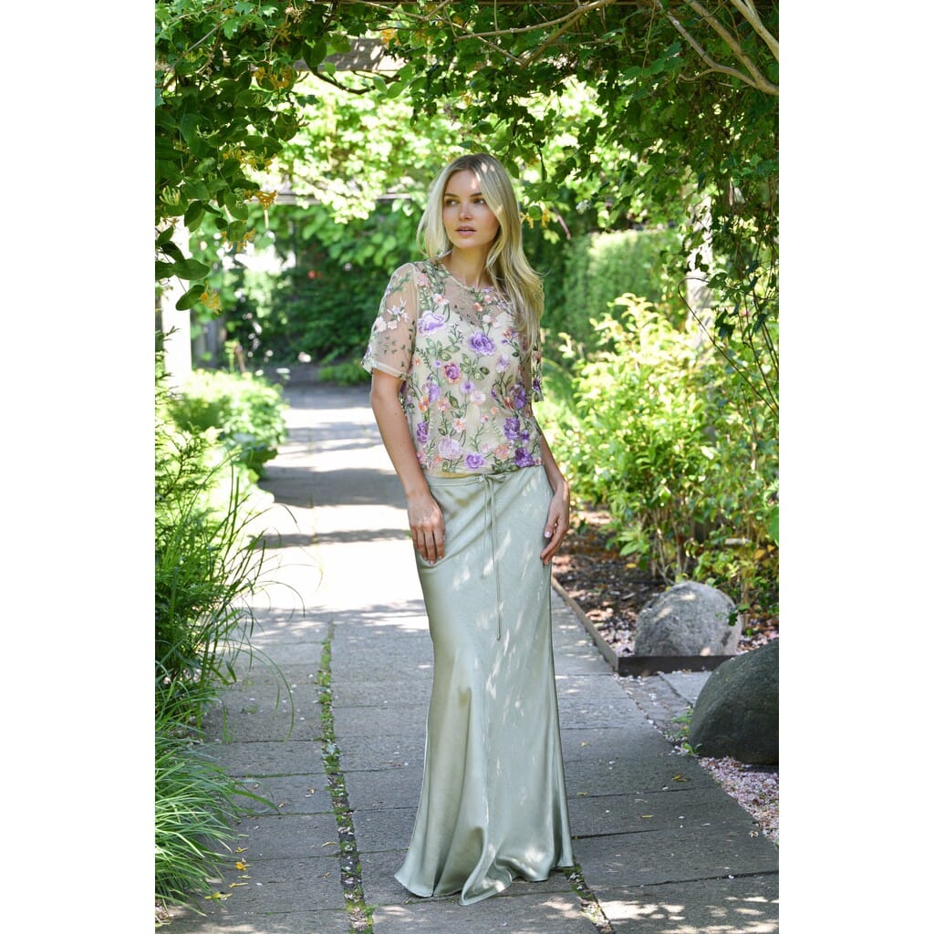 Blouse de la marque A-View, confectionnée en résille transparente dans des nuances de vert et de violet. La blouse présente des fleurs brodées et convient aussi bien aux occasions formelles que festives.