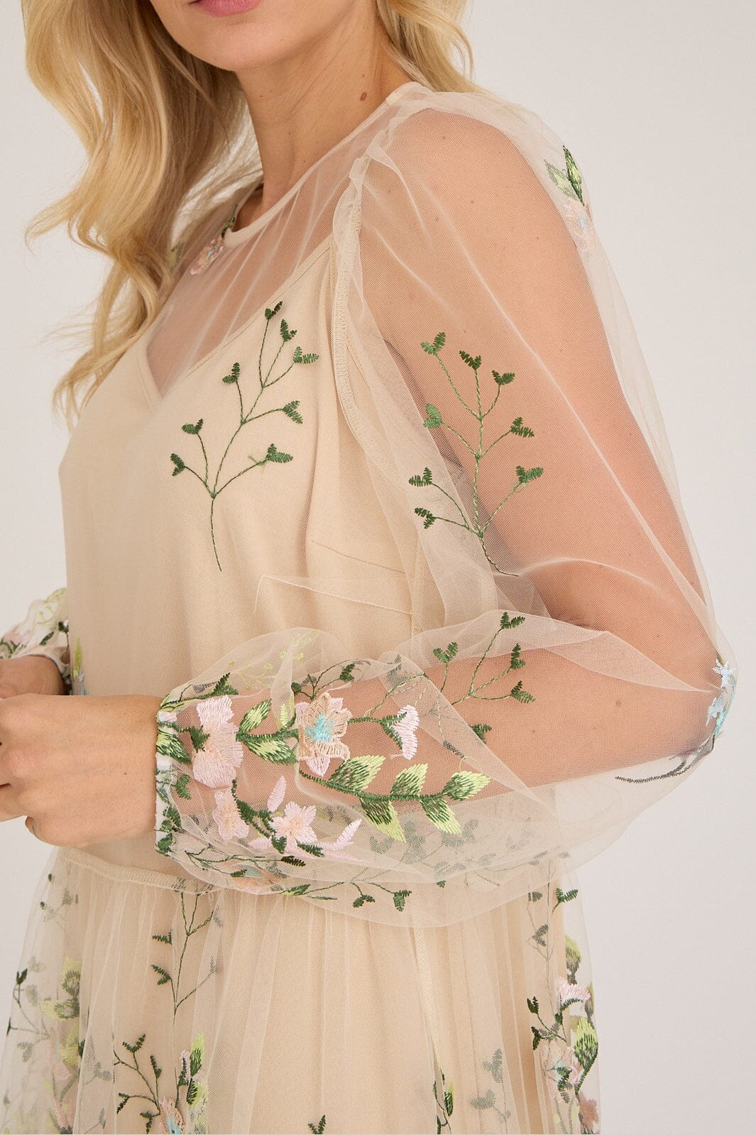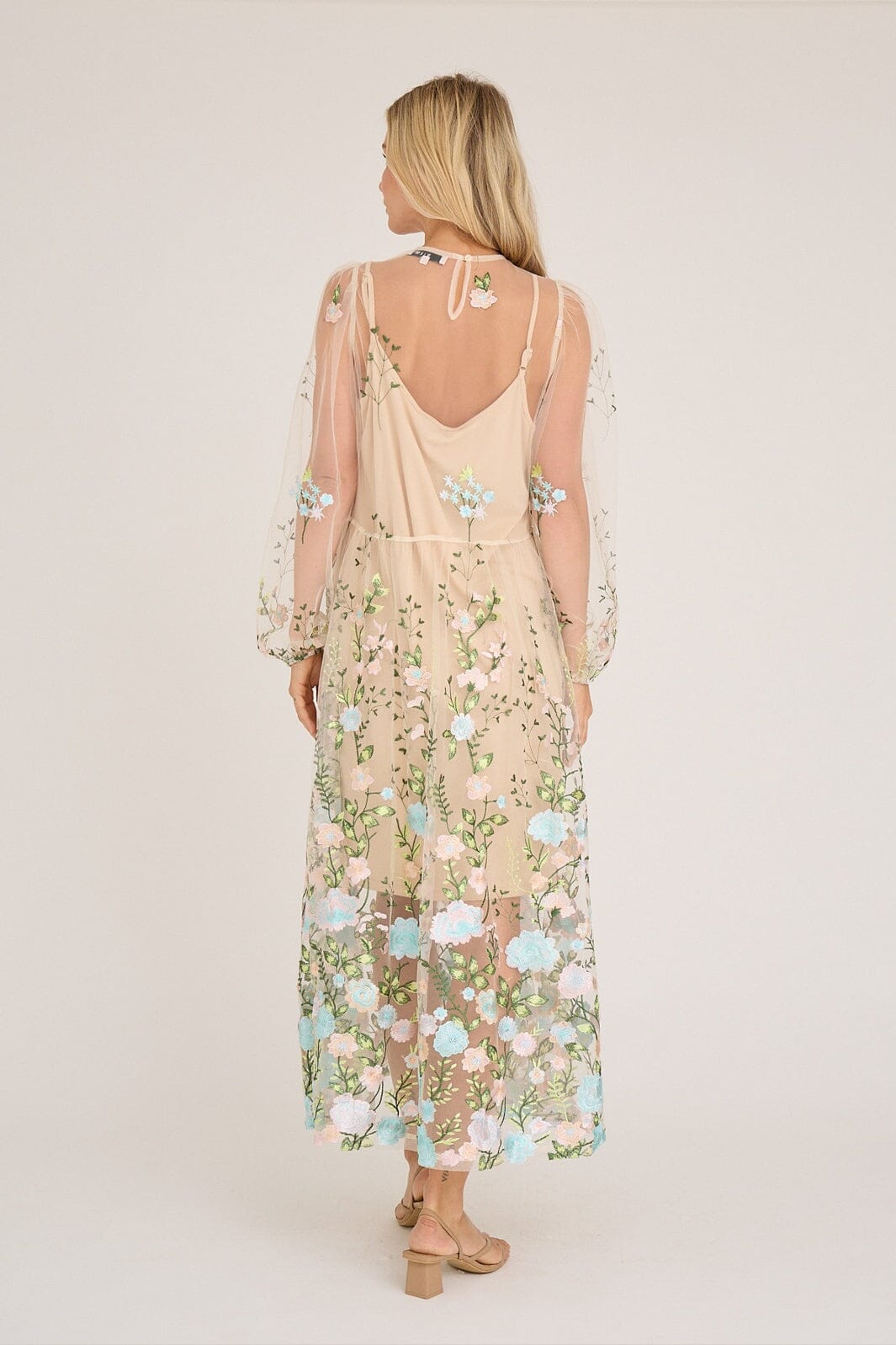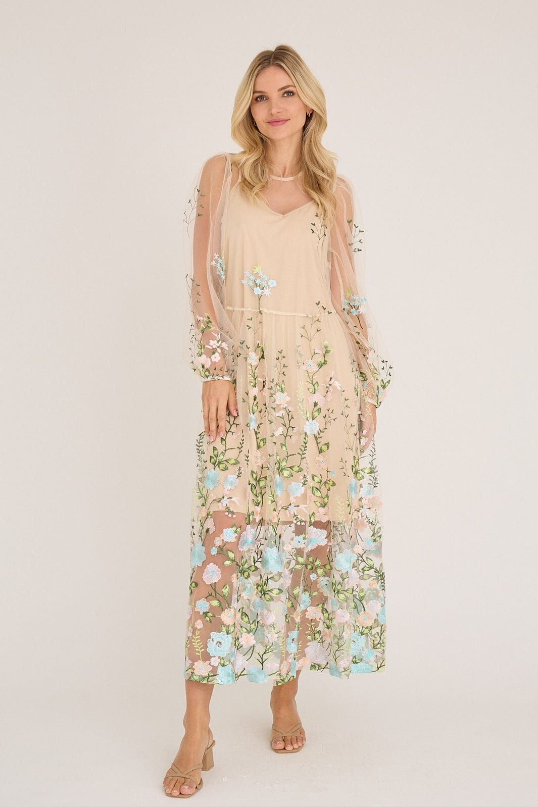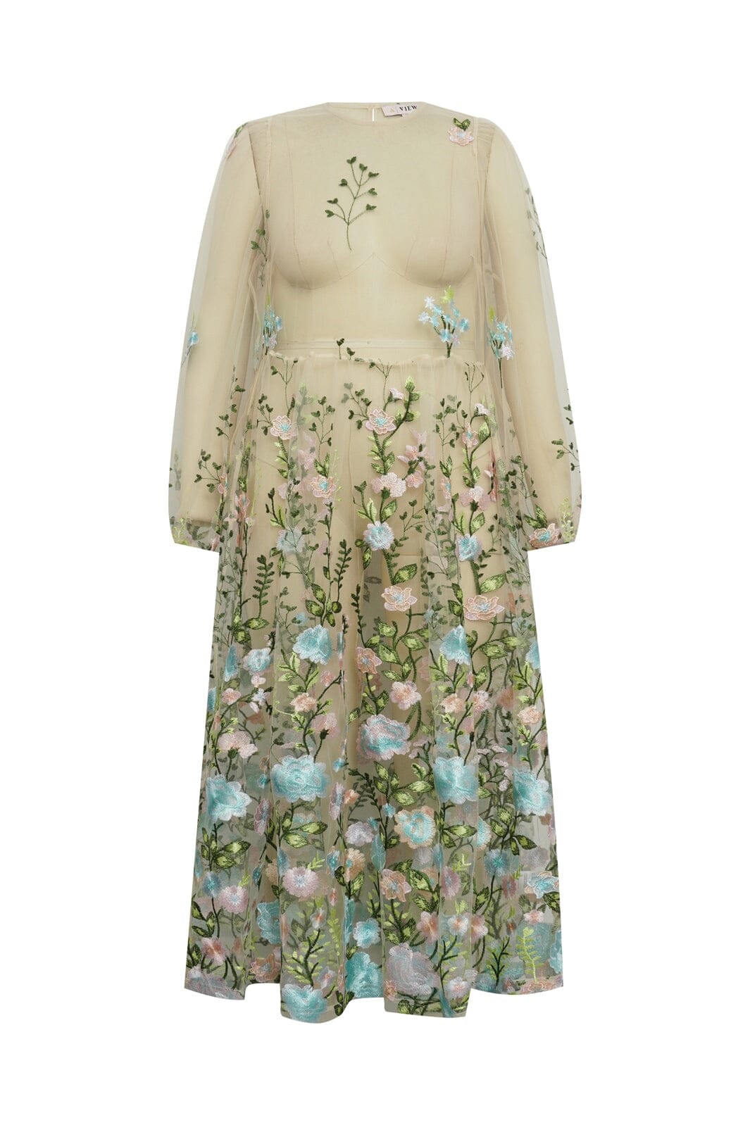 Robe A-View en mesh transparent avec des fleurs brodées dans des nuances de rose et de bleu. La robe présente une coupe ample et une longueur cheville.