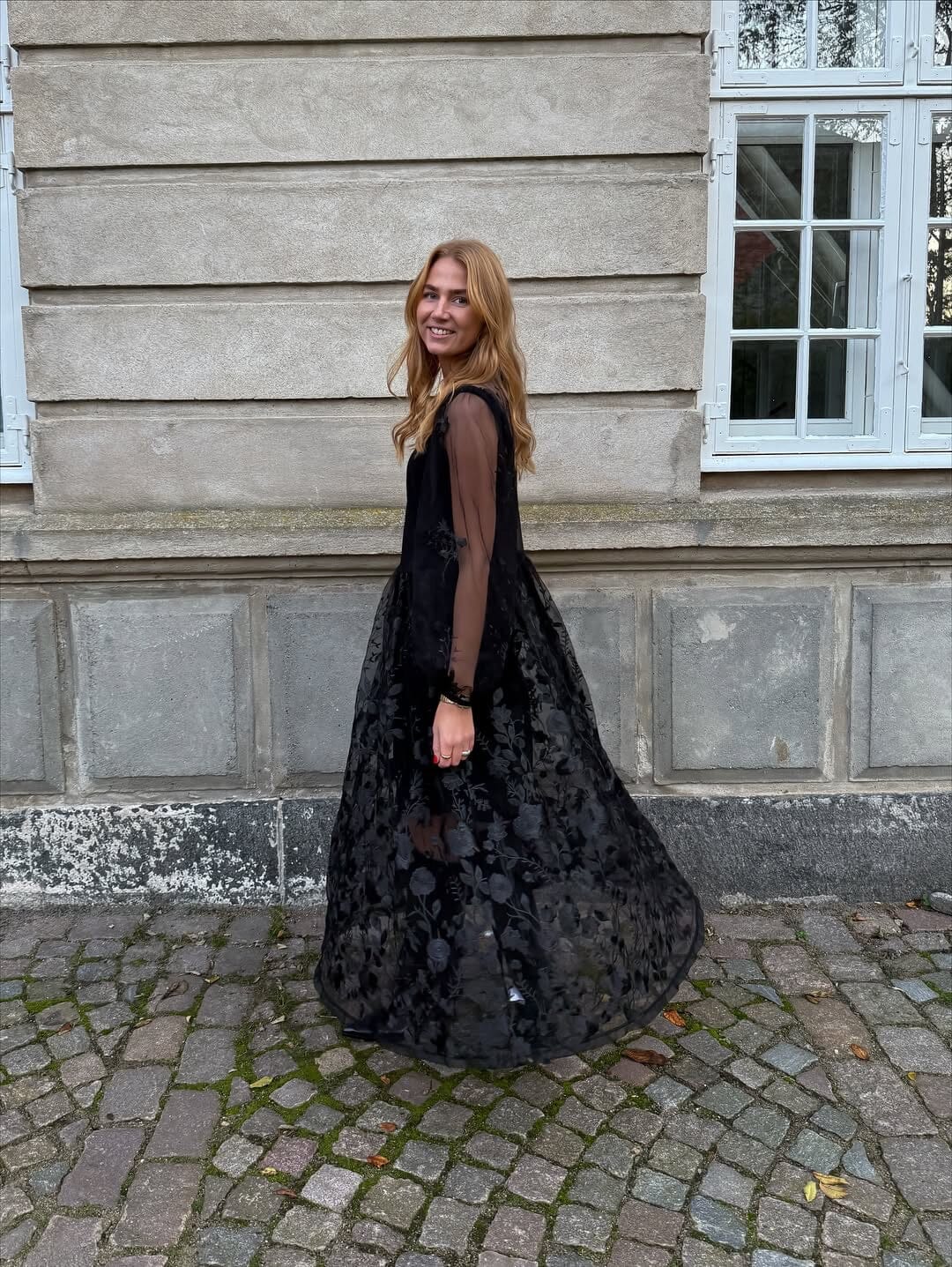 Robe noire de la marque A-View, confectionnée en mesh transparent avec des fleurs brodées. La robe est longueur cheville avec une jupe fluide.