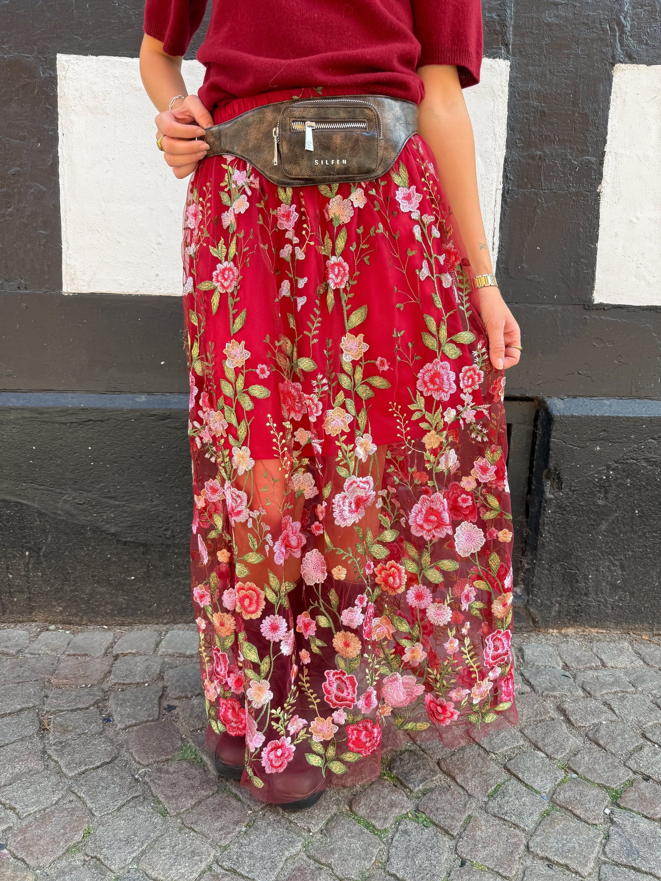 Jupe longue de A-View dans des nuances de bordeaux et de rose. La jupe a une couche transparente avec des fleurs brodées et est livrée avec une jupe courte en bordeaux.