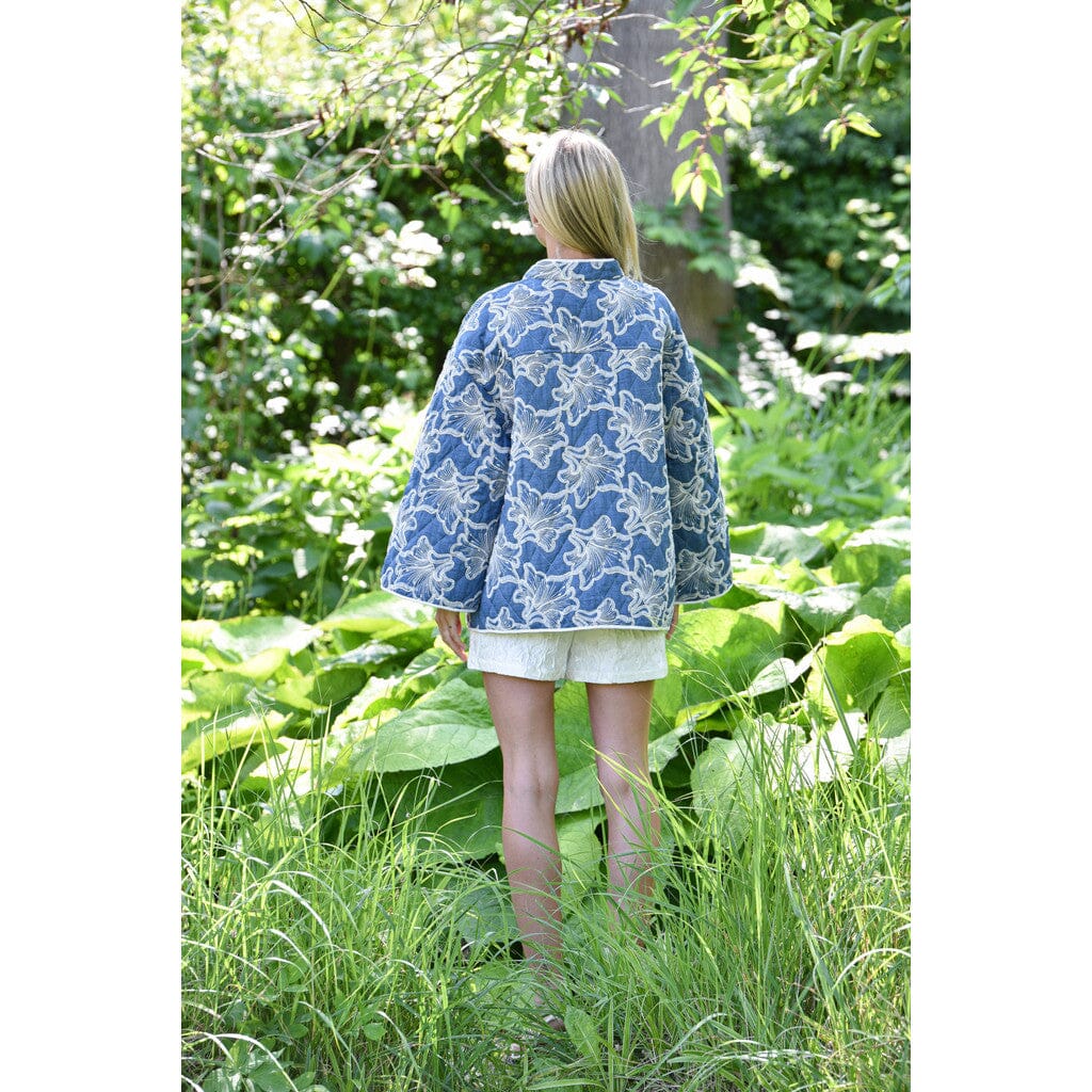 Veste bleue A-View avec broderies florales blanc cassé. La veste présente des surpiqûres décoratives et des liens à nouer qui lui donnent un aspect fait main.