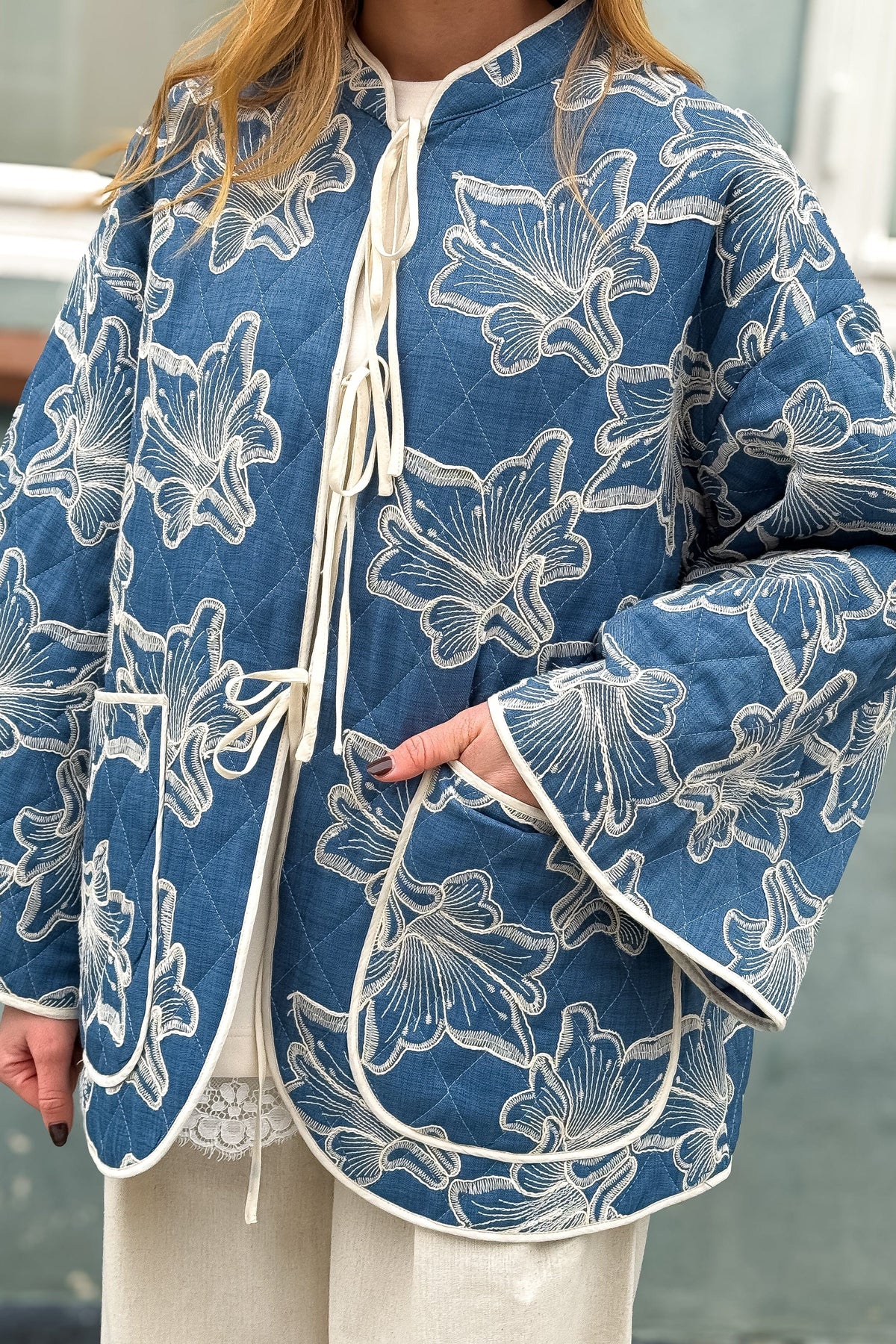 Veste bleue A-View avec broderies florales blanc cassé. La veste présente des surpiqûres décoratives et des liens à nouer qui lui donnent un aspect fait main.
