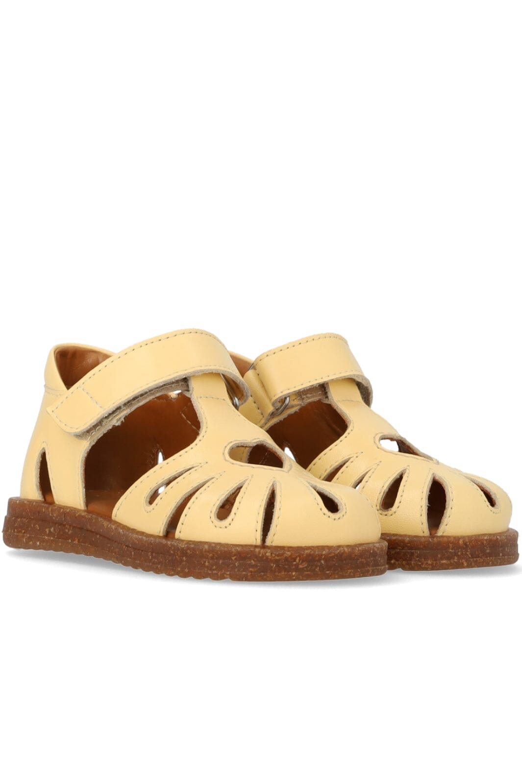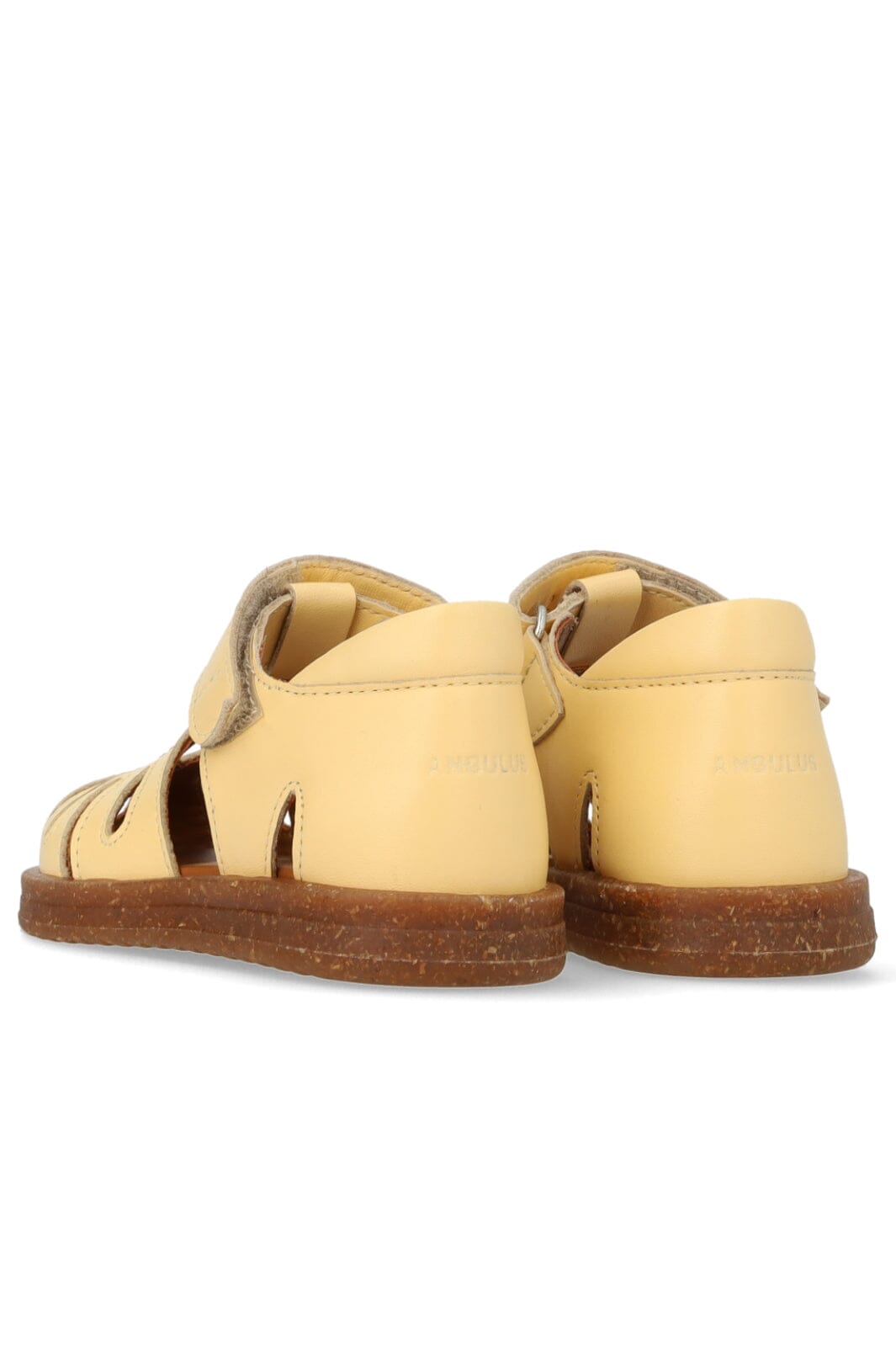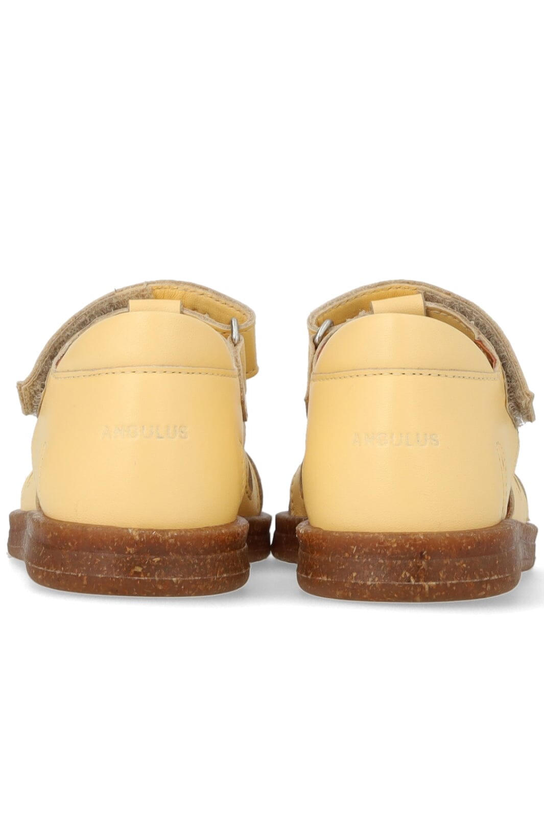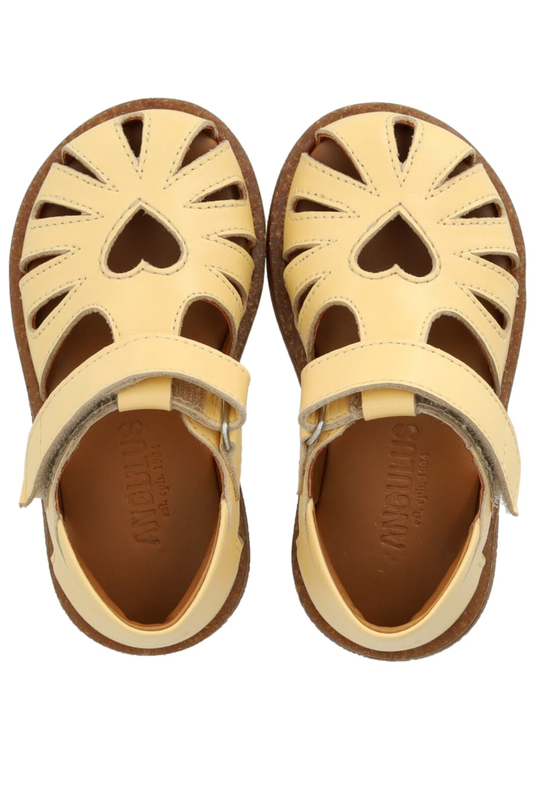 Sandales jaunes d'Angulus avec découpe en forme de cœur à l'avant. Les sandales ont une doublure en cuir sans chrome et une fermeture velcro pratique qui les rend faciles à enfiler et à retirer.