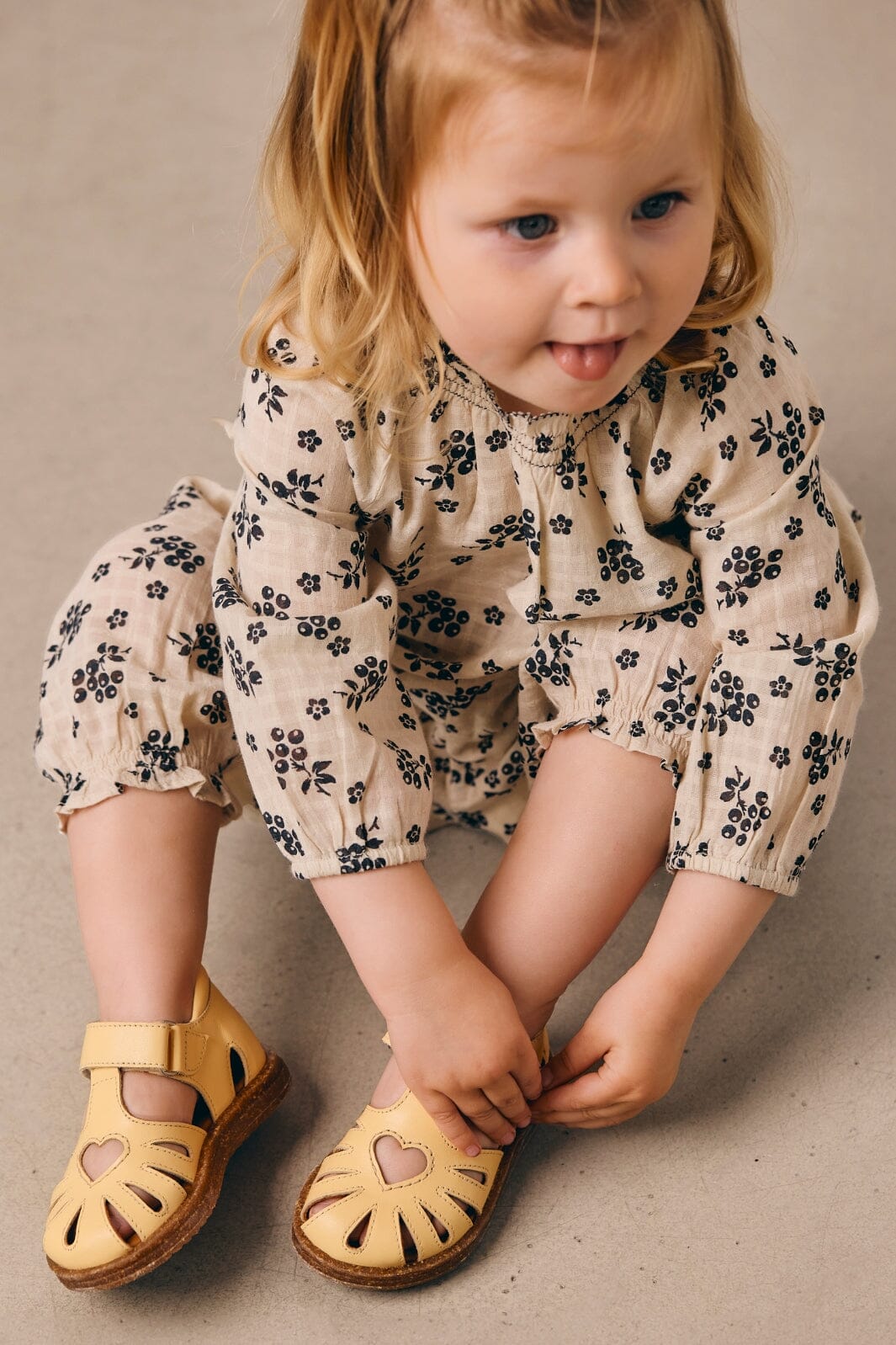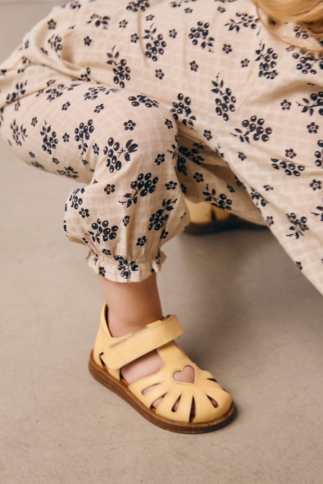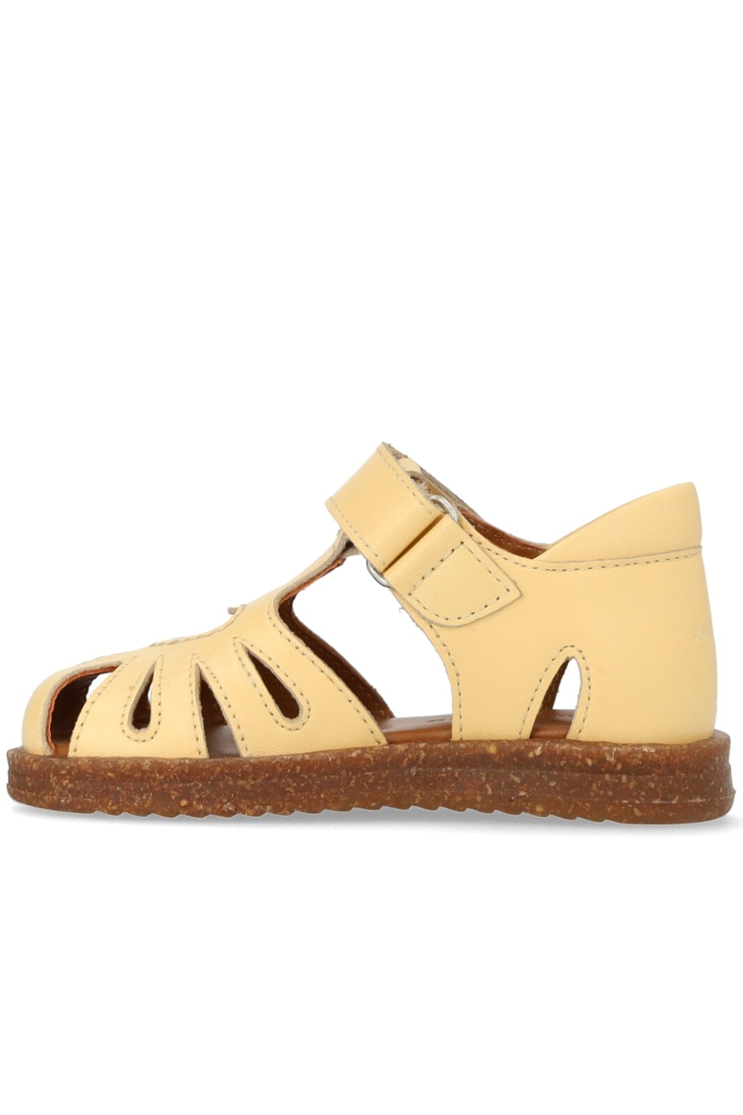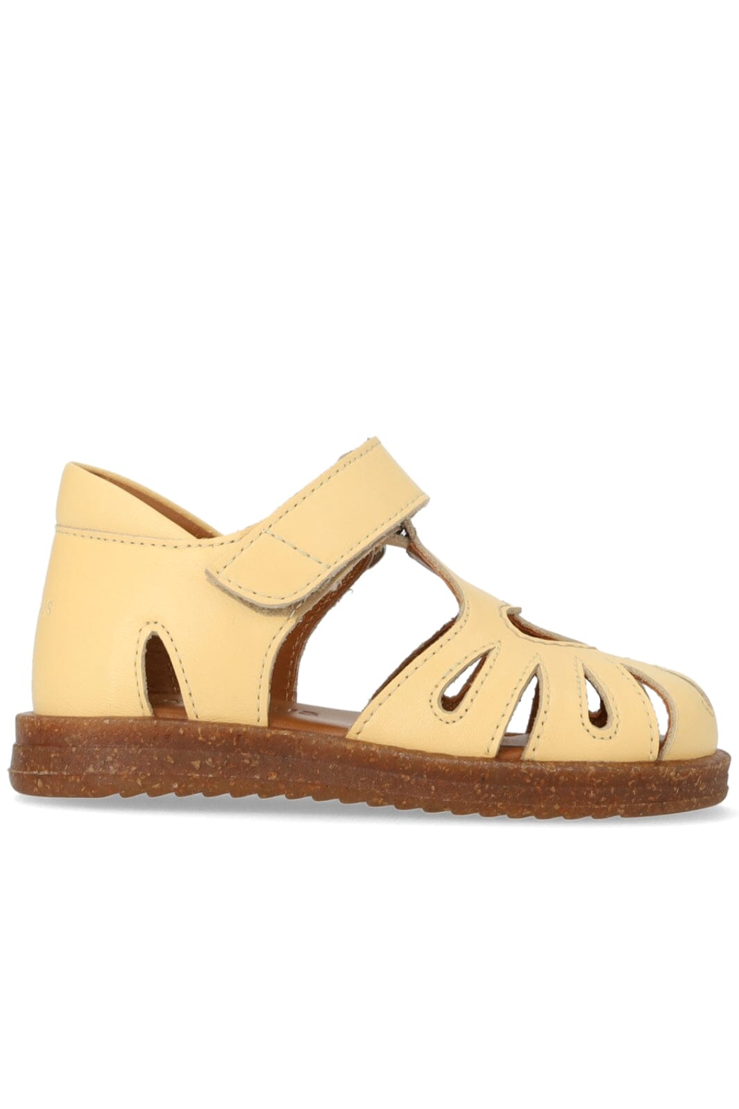 Sandales jaunes d'Angulus avec découpe en forme de cœur à l'avant. Les sandales ont une doublure en cuir sans chrome et une fermeture velcro pratique qui les rend faciles à enfiler et à retirer.