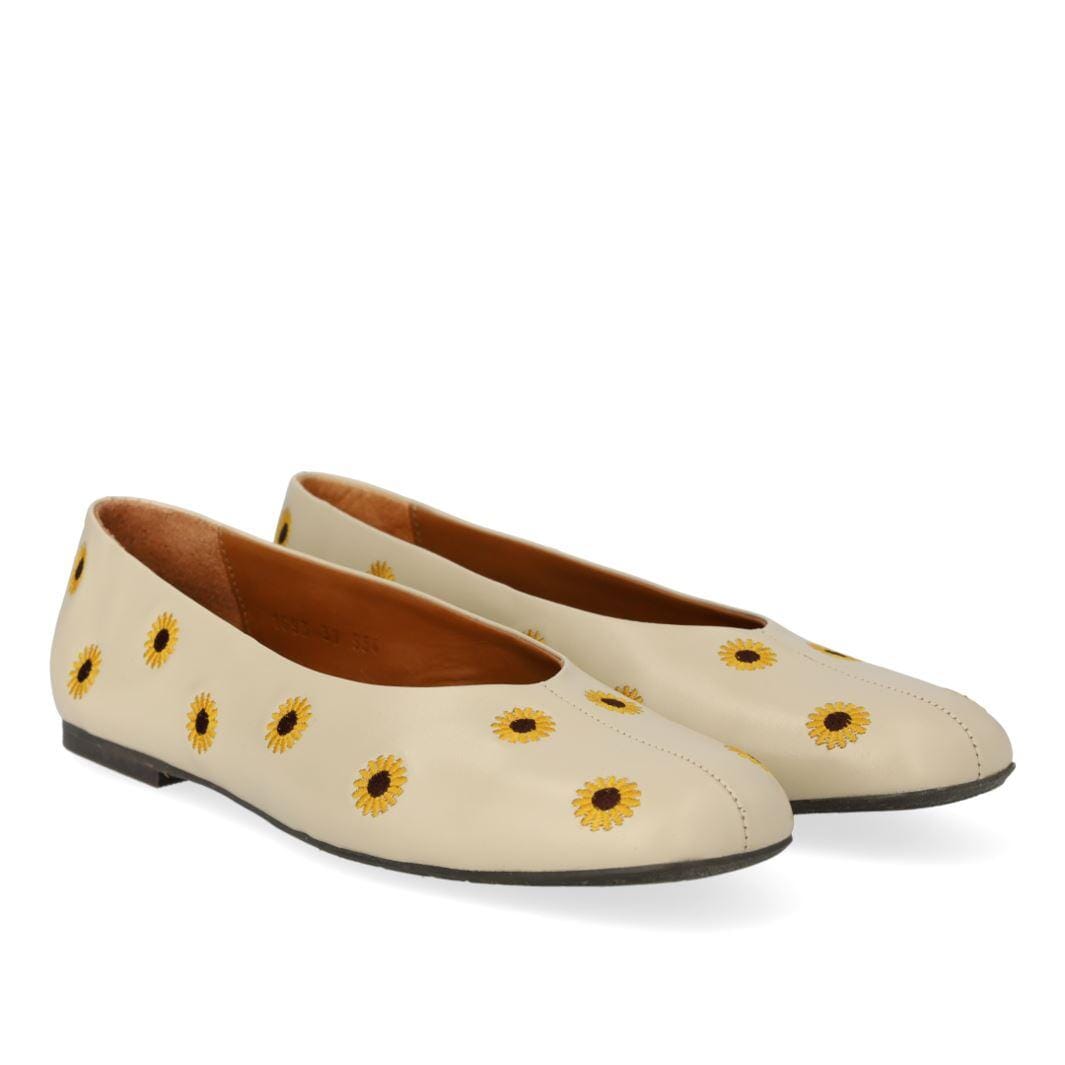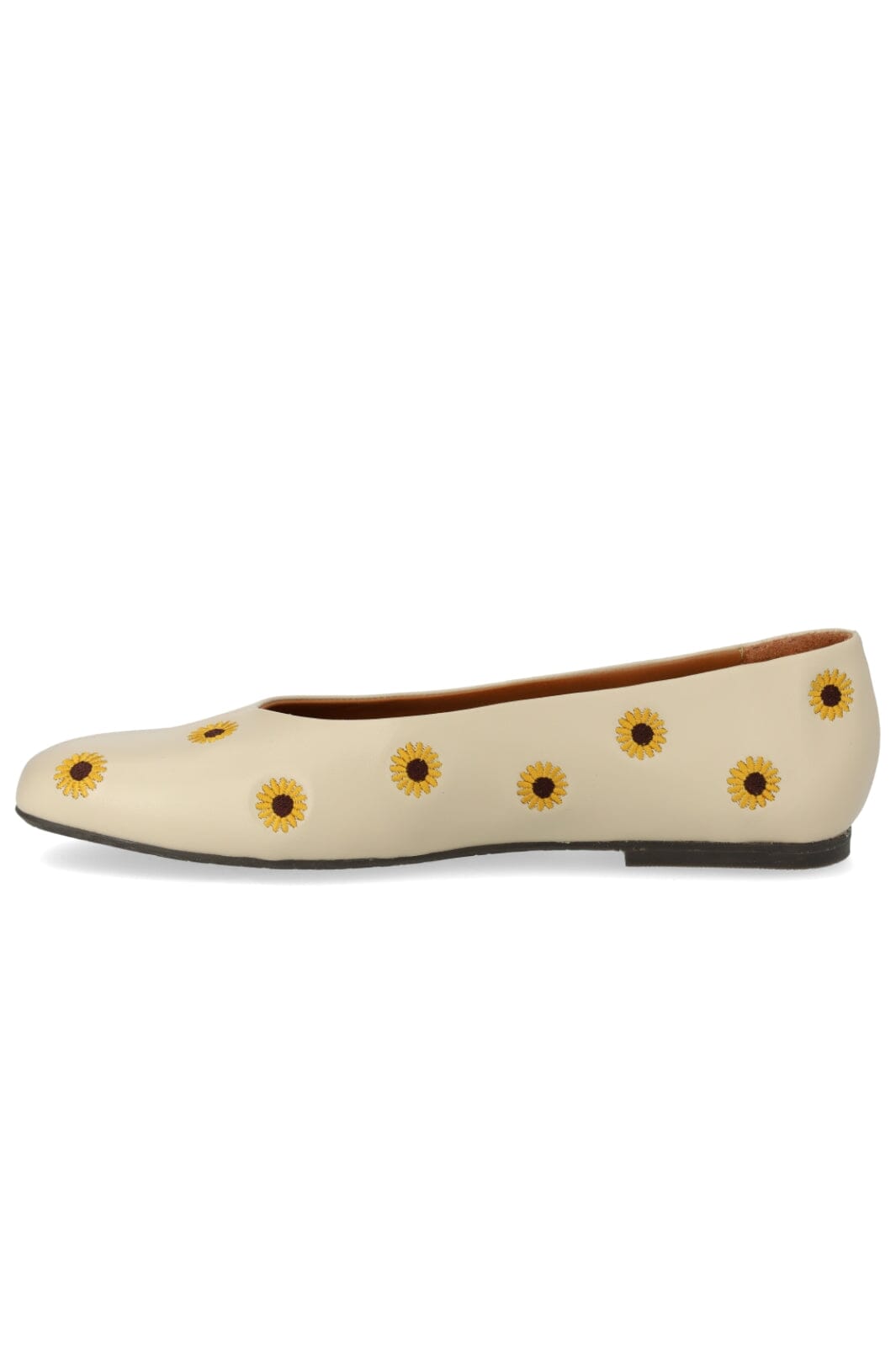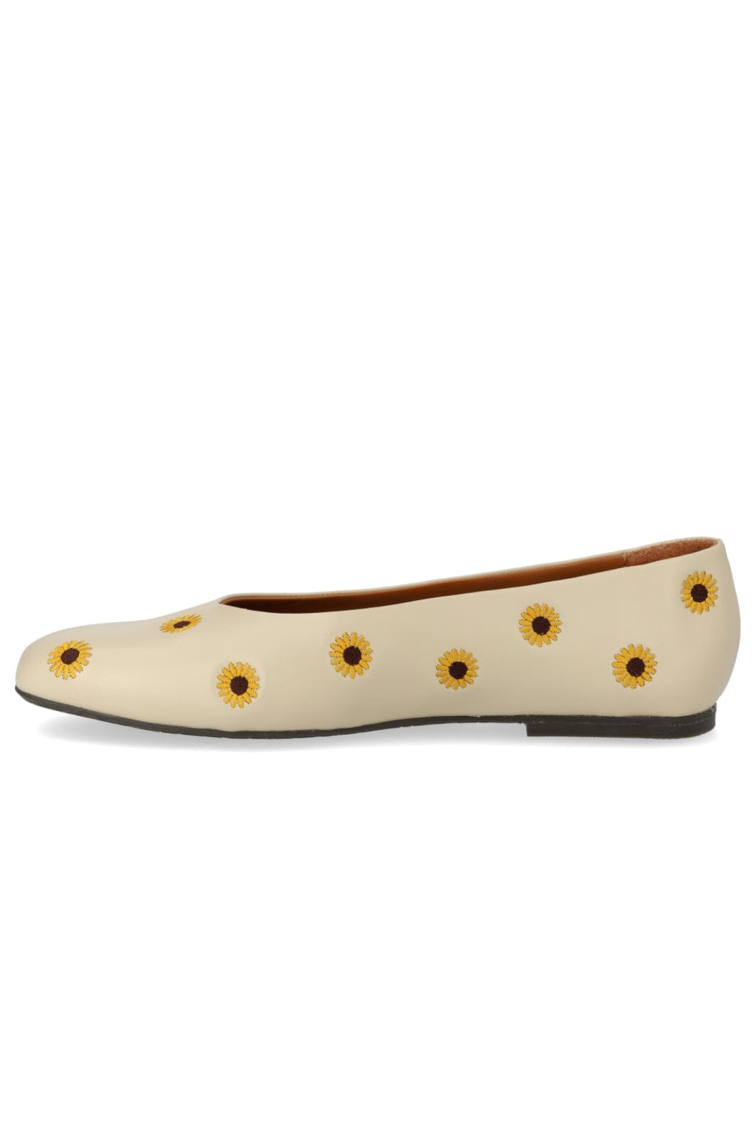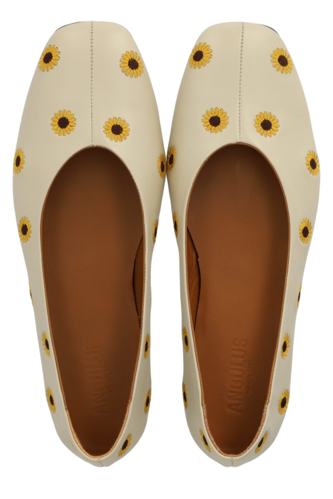 Ballerines couleur crème d'Angulus avec des tournesols brodés. Les chaussures ont un bout rond et sont fabriquées en cuir avec une doublure en cuir sans chrome et une semelle en caoutchouc.