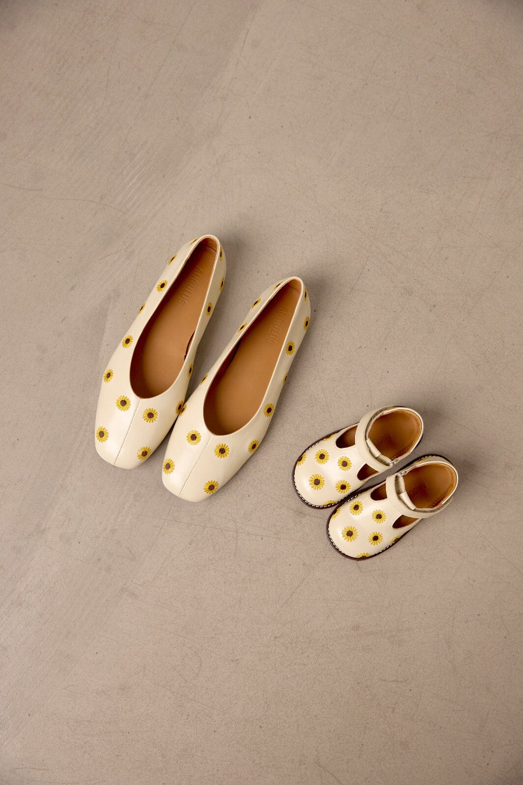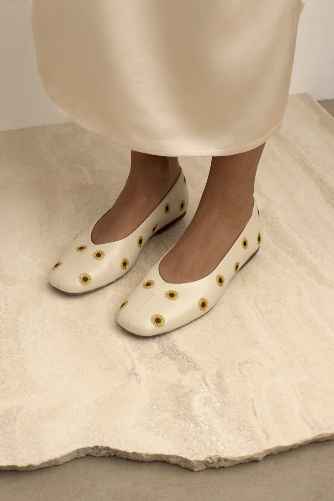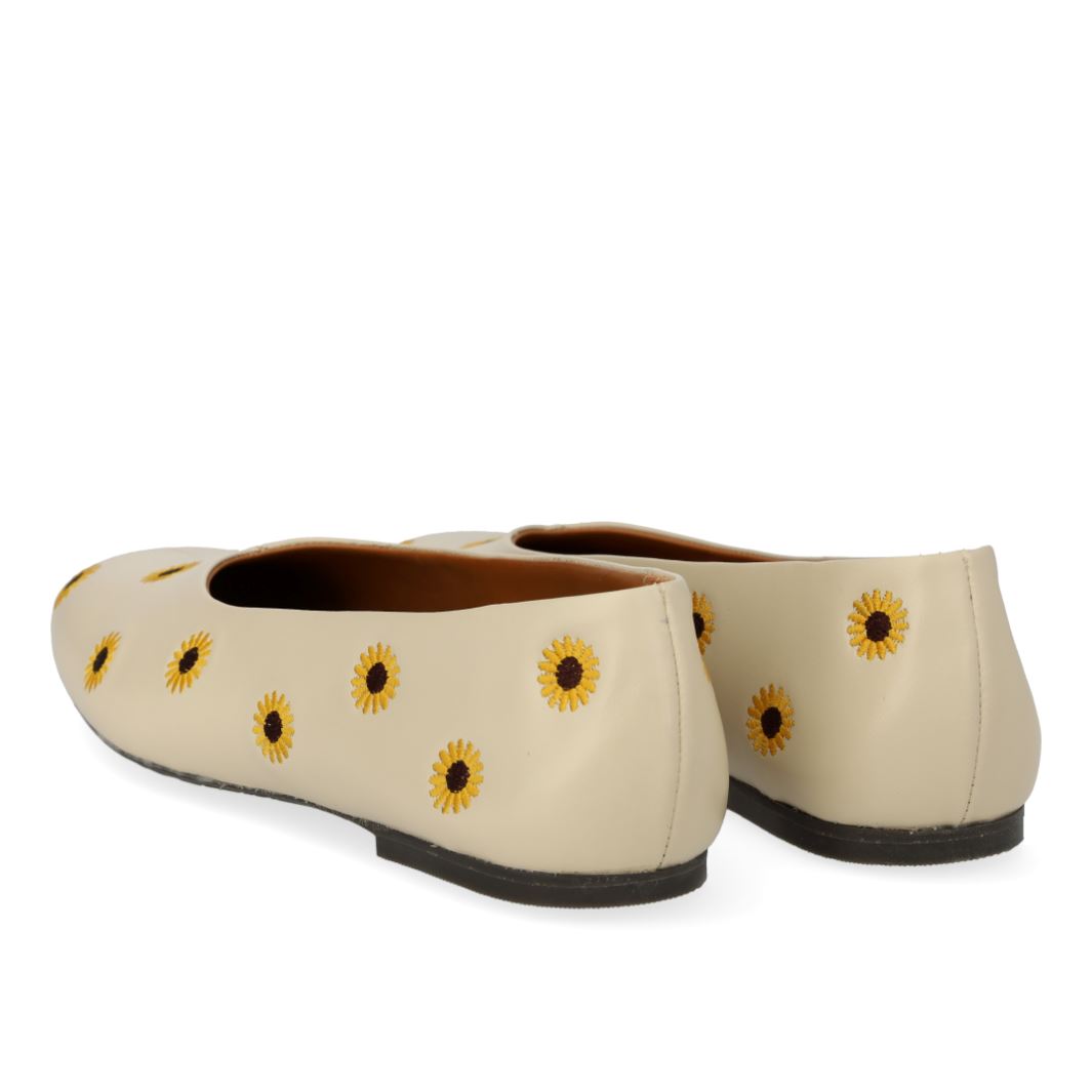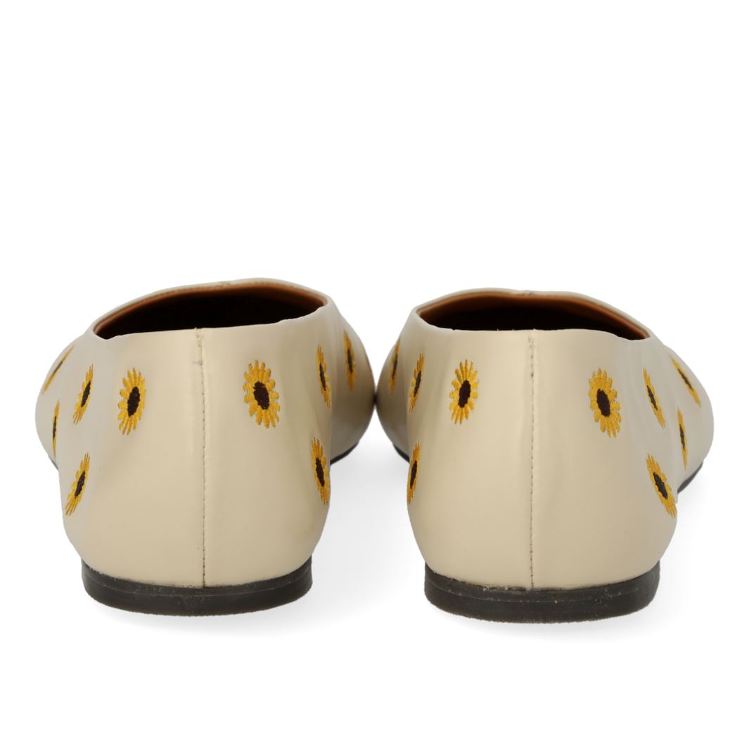 Ballerines couleur crème d'Angulus avec des tournesols brodés. Les chaussures ont un bout rond et sont fabriquées en cuir avec une doublure en cuir sans chrome et une semelle en caoutchouc.
