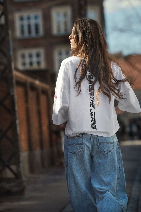 Jean bleu clair de Ball avec une jambe incurvée. Le jean possède une taille haute et une coupe ample.