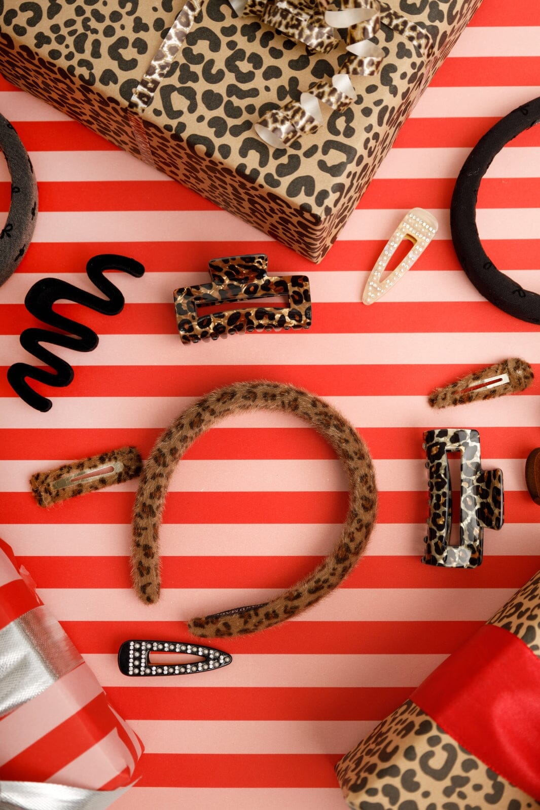 Barrettes de cheveux de Black Colour avec motif léopard brun et surface douce. L'ensemble se compose de deux barrettes avec des fermoirs en métal qui maintiennent les cheveux en place toute la journée.