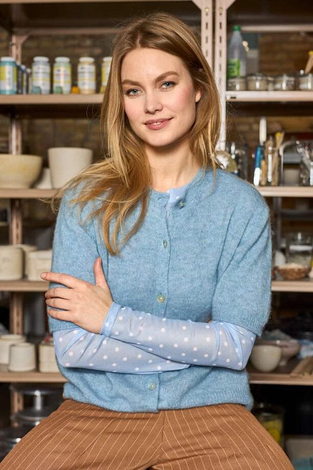 Cardigan bleu clair de Black Colour avec manches courtes et encolure ronde. Le cardigan a une coupe regular et est orné de détails en perles.