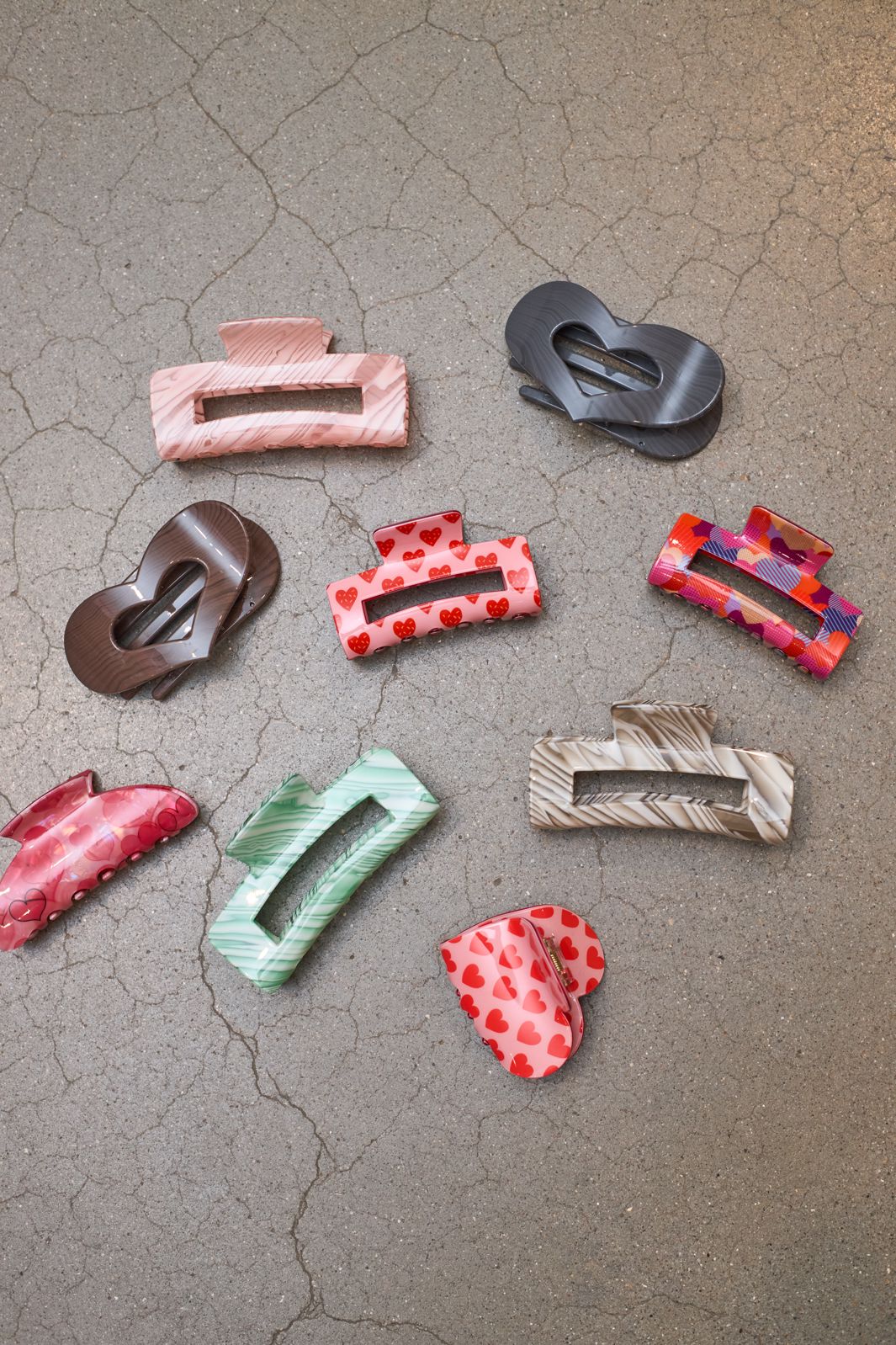Pince à cheveux de Black Colour, fabriquée en acrylique rose avec des cœurs rouges. Le design combine une base rose avec un motif de cœur rouge.