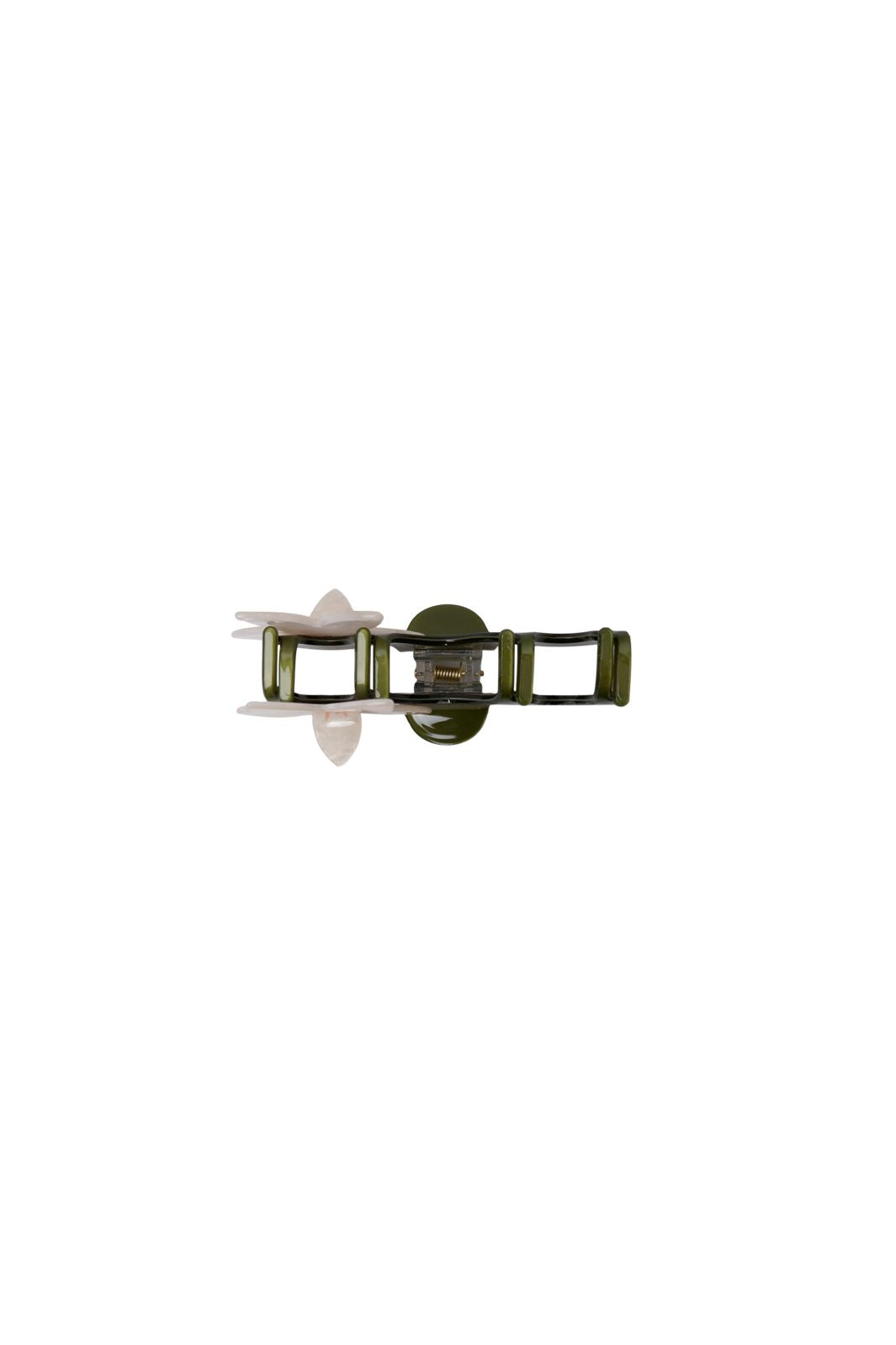 Pince à cheveux de Black Colour, fabriquée en acrylique dans une teinte blanche. La pince a une forme de fleur avec des détails verts.