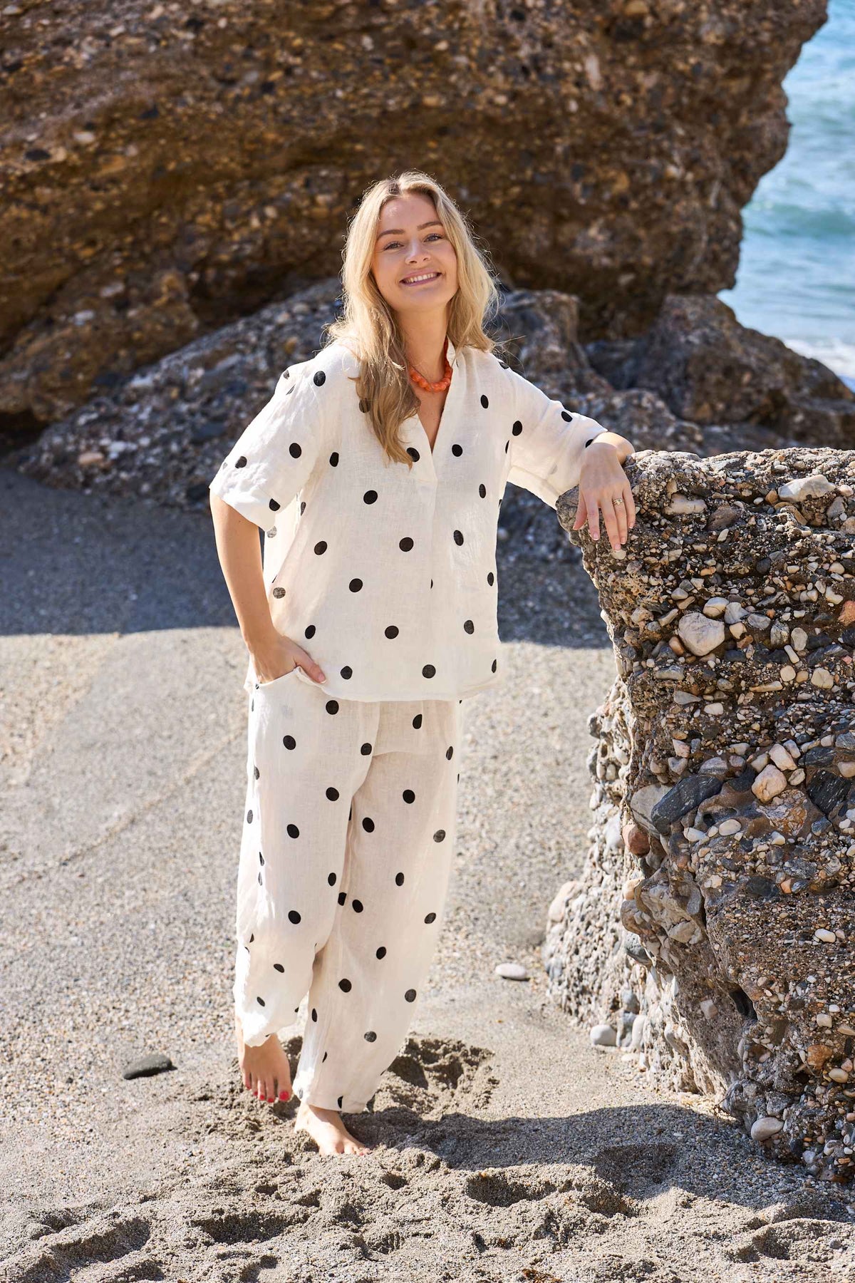 Blouse en lin de Black Colour avec un motif à pois noirs sur un fond blanc crème. La blouse possède un décolleté en V, des manches courtes et une coupe de type pull-over.