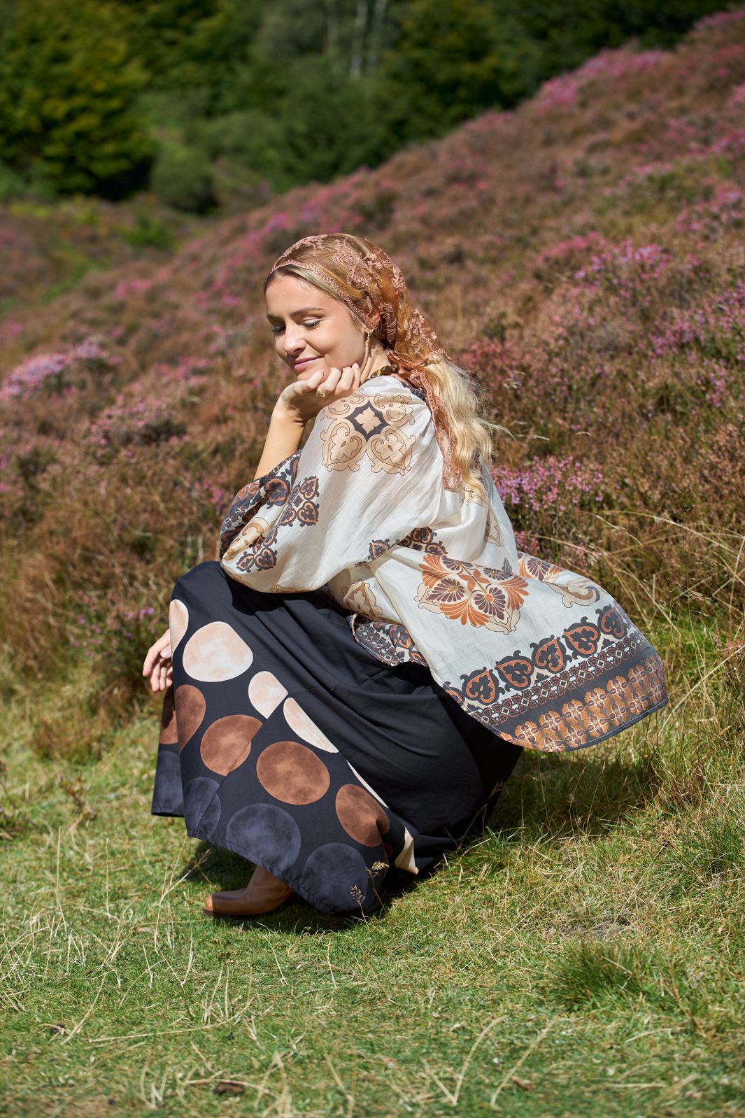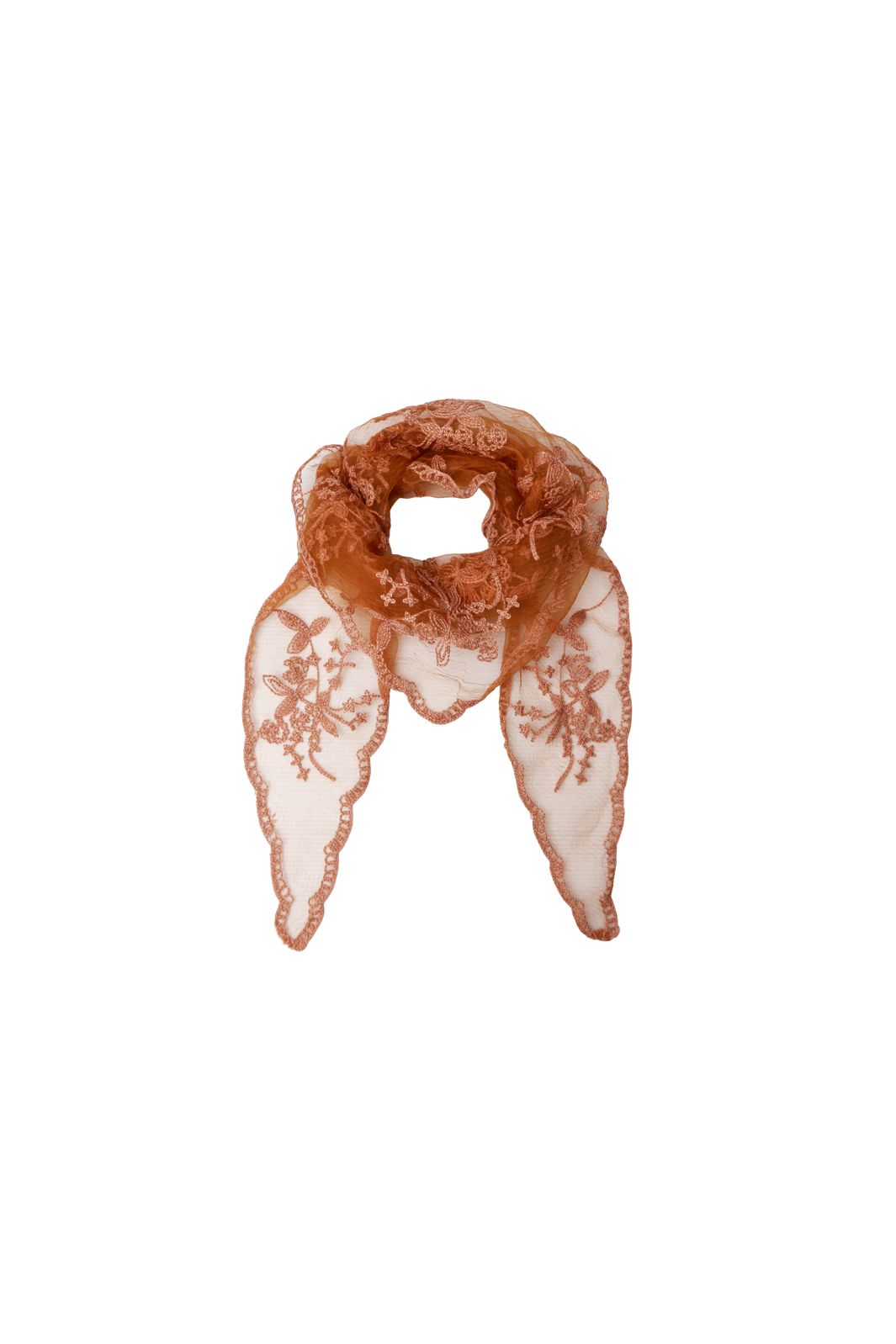 Écharpe triangulaire de Black Colour dans une nuance tabac. L'écharpe a un matériau en dentelle transparent avec broderie florale sur toute la surface.