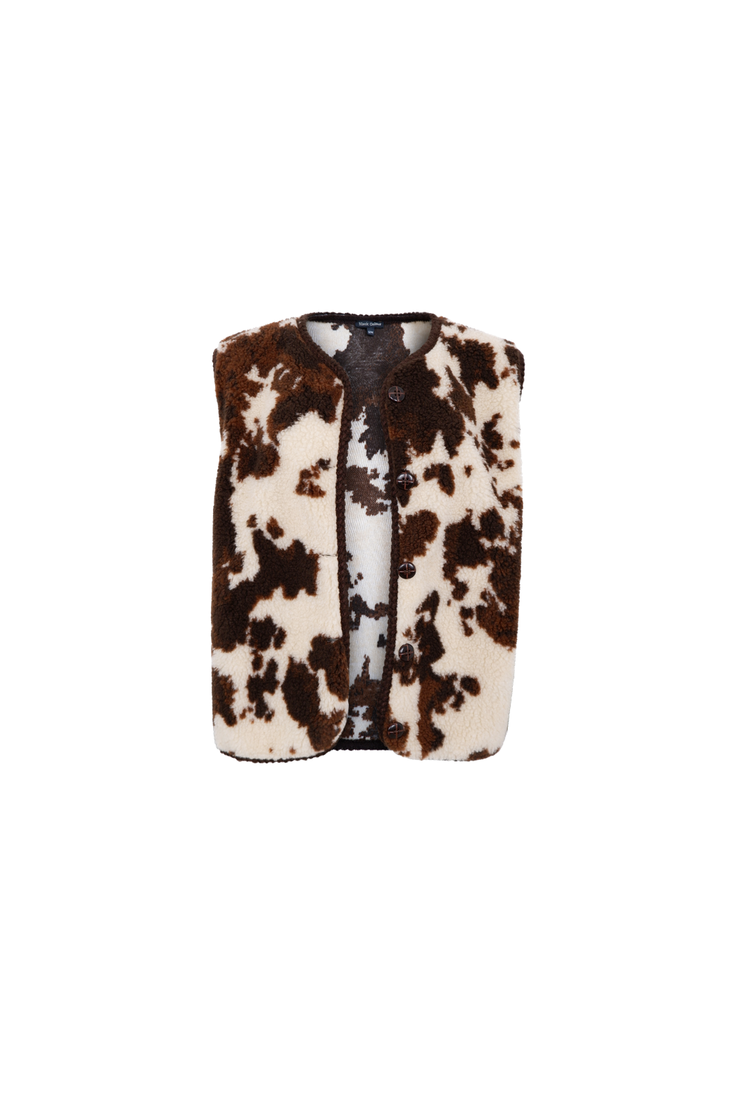 Gilet de la marque Black Colour avec imprimé animal brun et crème. Le gilet est en polyester et présente une coupe sans manches avec fermeture à boutons.