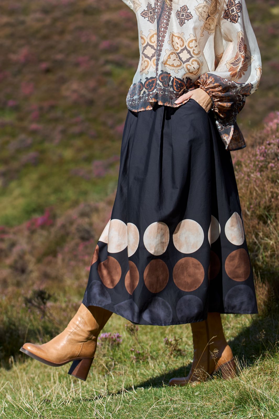Jupe noire de Black Colour avec de grands pois bruns et beiges le long du bord. La jupe a une taille haute et arrive jusqu'aux mollets avec une coupe décontractée.