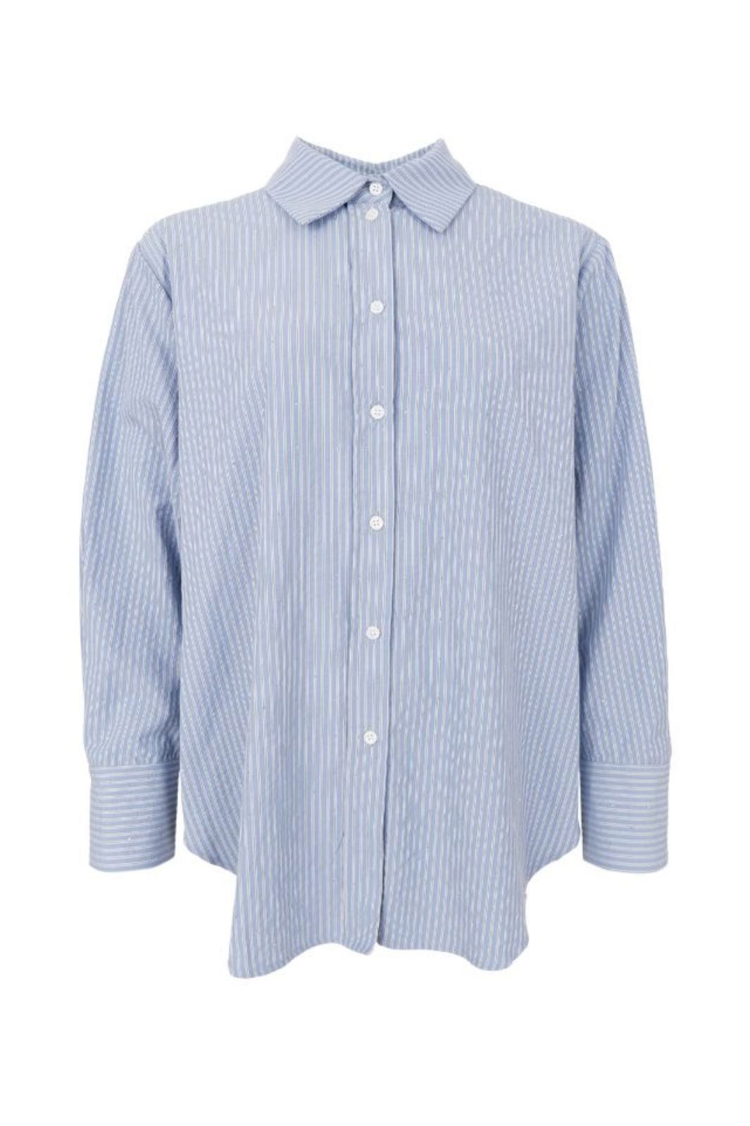 Chemise rayée de Black Colour en bleu clair. La chemise a des paillettes comme détail et une coupe oversized avec un col de chemise classique et des boutons sur toute la longueur.