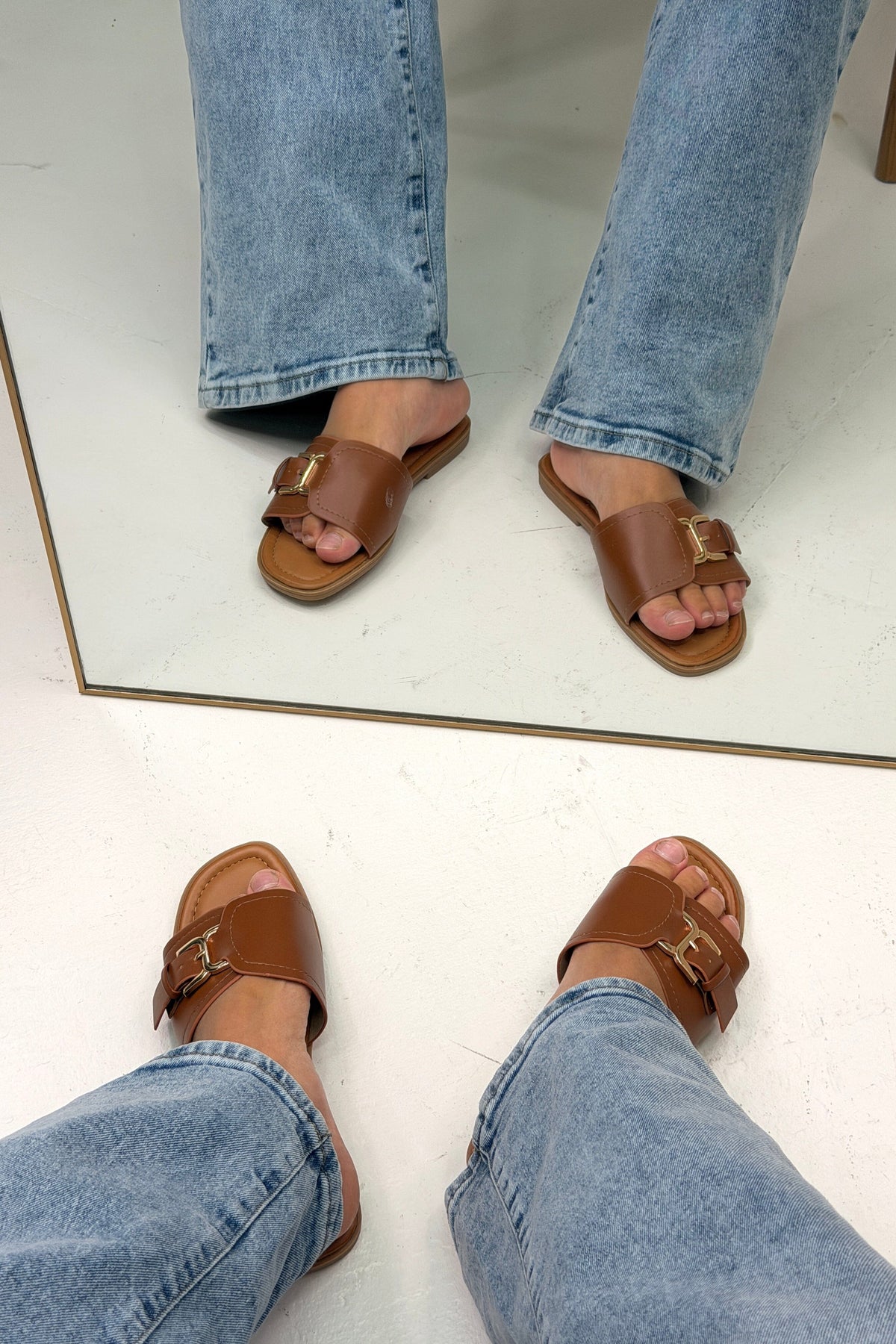 Sandales Bloom dans une teinte couleur camel. Les sandales ont un bout ouvert et un arrière bas, ce qui les rend confortables pour la marche.