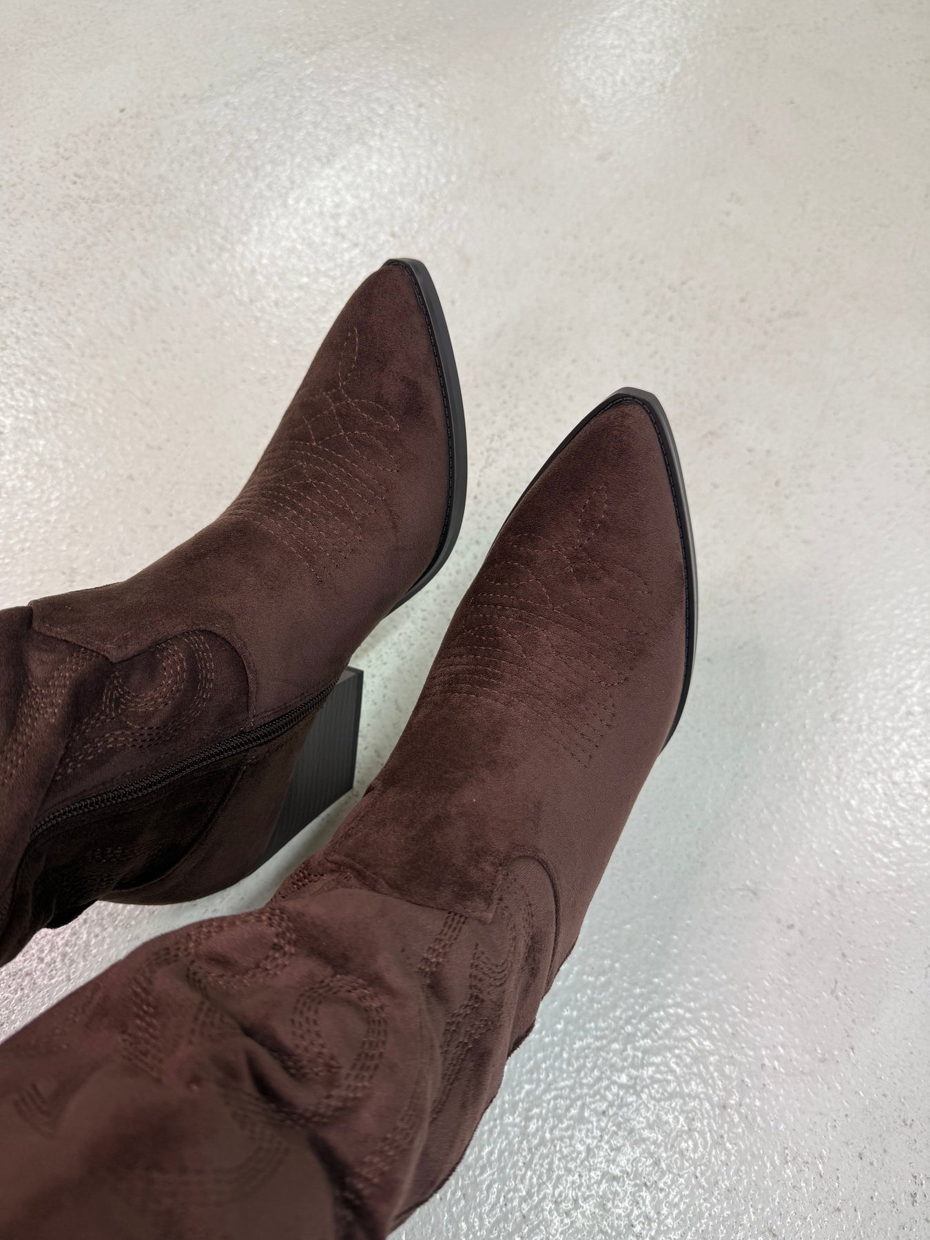 Bottes Bloom de couleur marron avec des coutures décoratives le long de la tige. Les bottes ont un talon bloc et un bout pointu.
