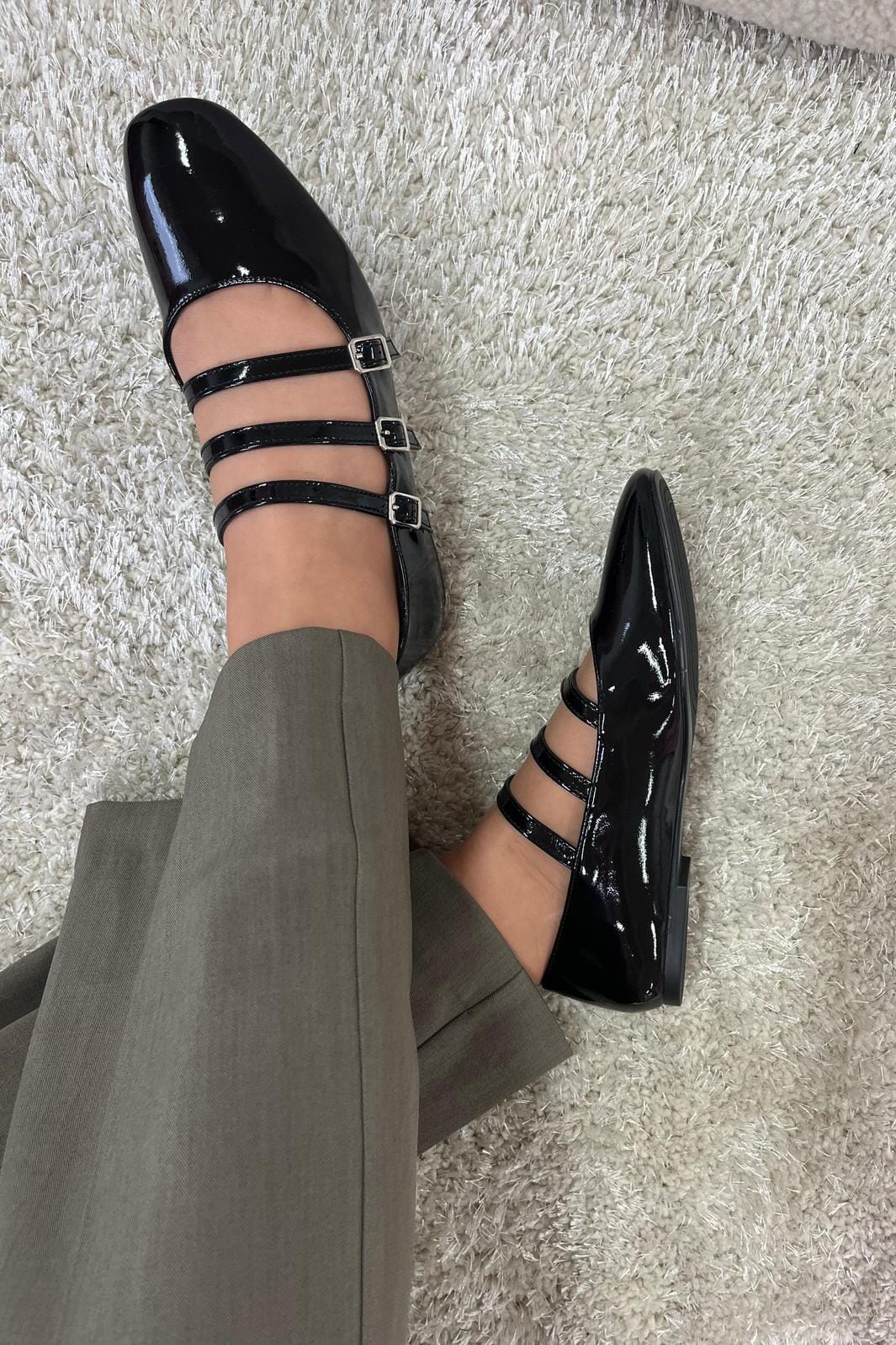 Chaussures vernies noires à trois boucles de Bloom. La pointe effilée et les fines lanières donnent à la chaussure une expression classique qui convient aussi bien aux occasions festives qu'aux événements formels.