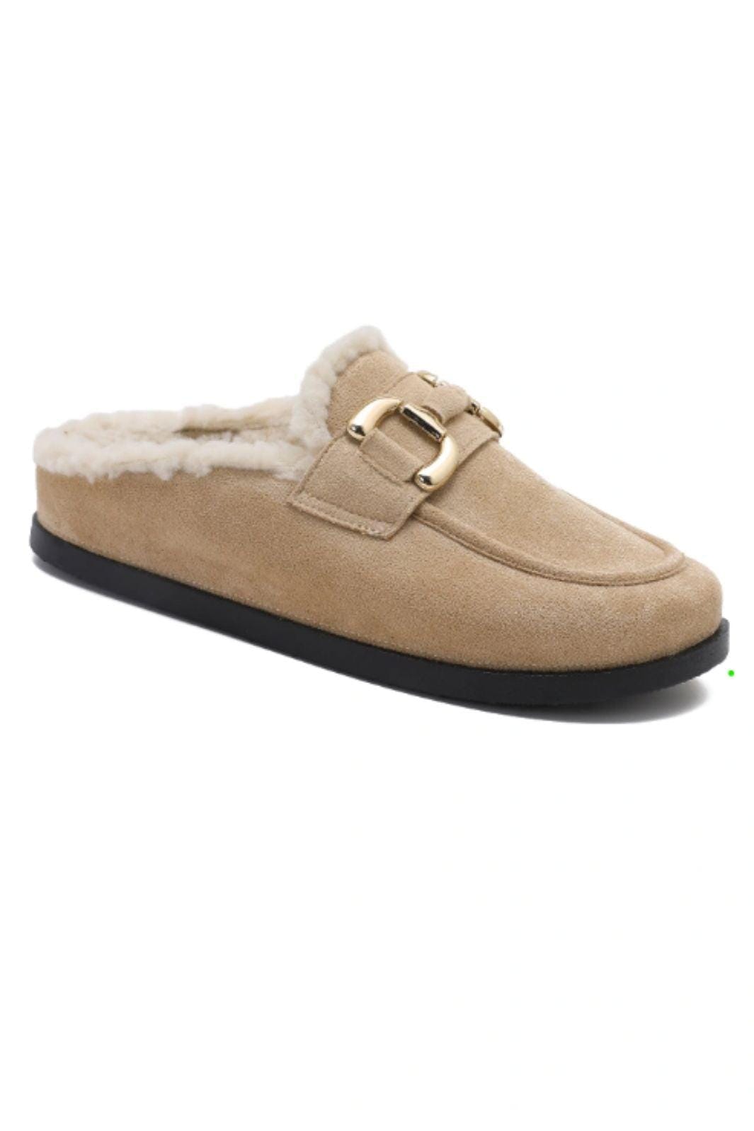 Chaussons de Bloom en taupe avec boucle dorée sur le dessus. La doublure en peluche blanche et la semelle noire offrent une combinaison pratique de confort et de durabilité.