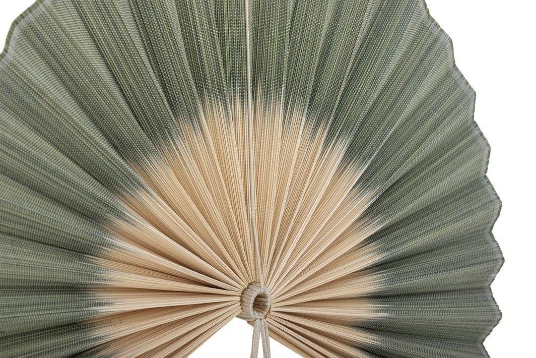 Décoration murale Bloomingville en 100 % bambou avec des plis verts et un centre beige. Le design présente une forme d’éventail en demi-cercle avec un pompon.