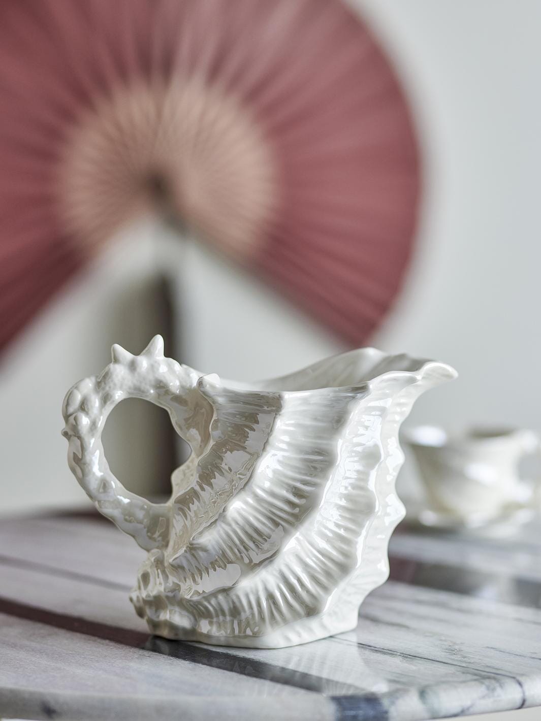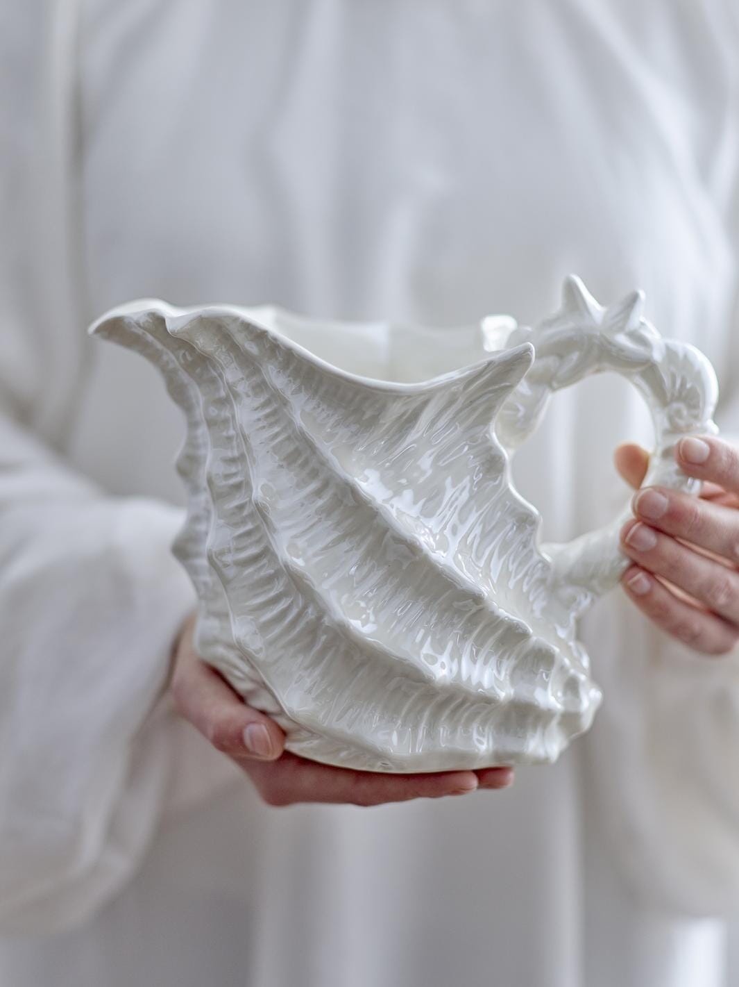 Pichet blanc de Bloomingville, en grès, avec une forme inspirée d’un coquillage. La surface est ondulée et brillante, et l’anse présente des détails avec des motifs de coquillages et d’étoiles de mer.