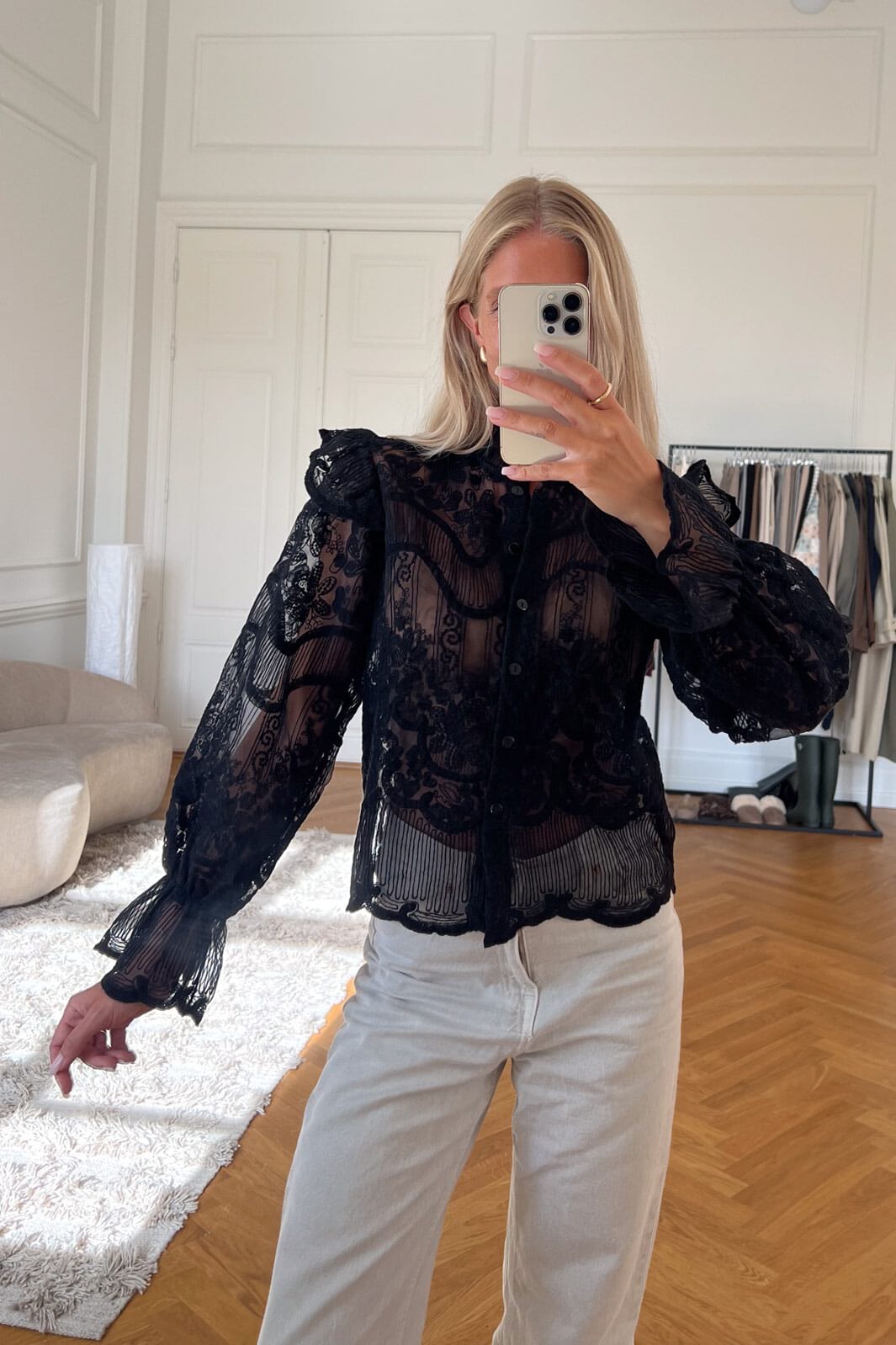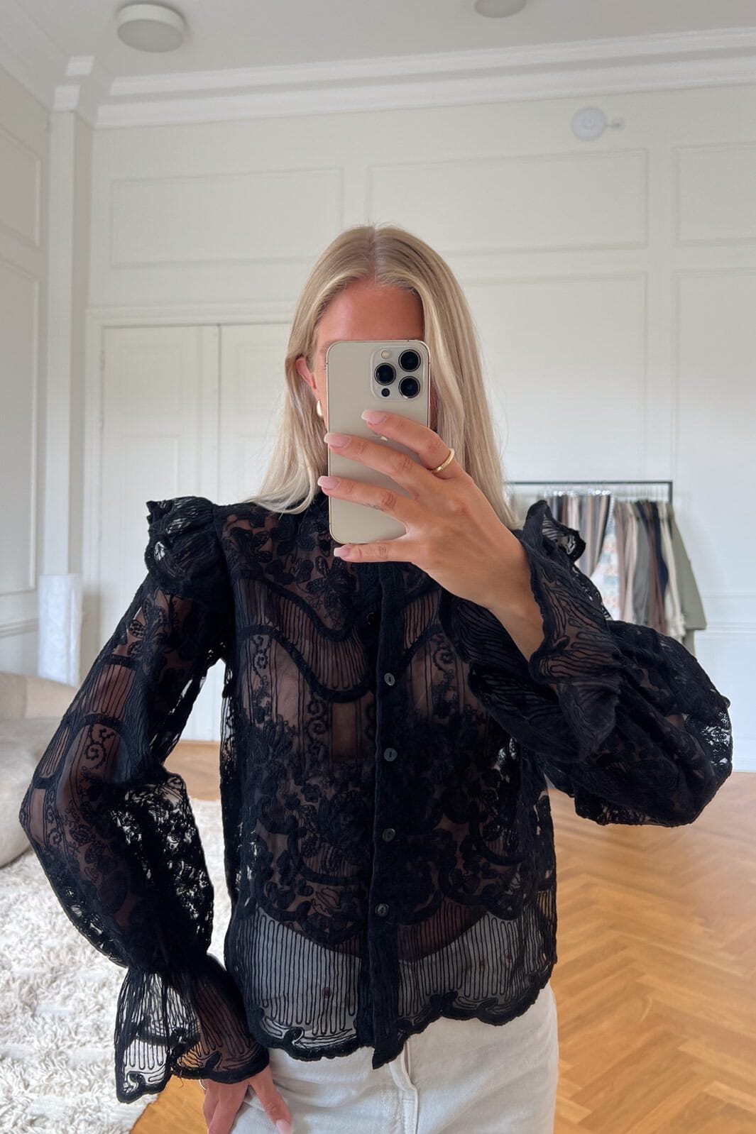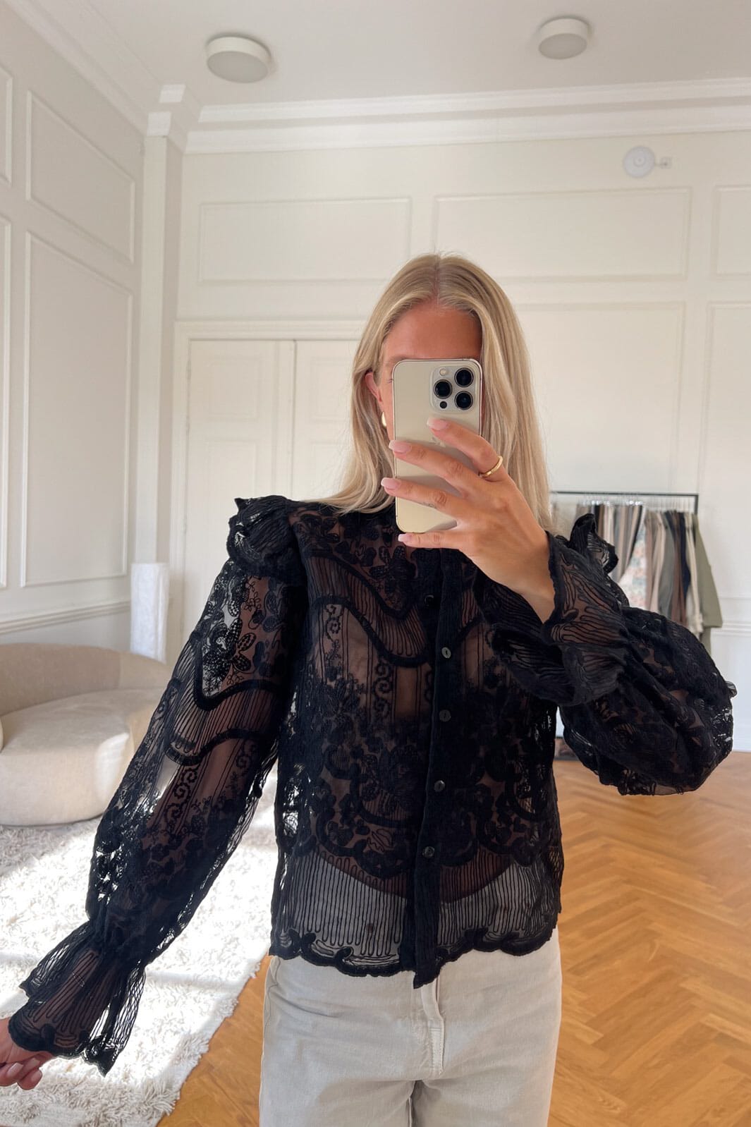 Chemise noire en dentelle transparente avec col montant et fermeture à boutons. La chemise a des manches bouffantes avec des détails en volants et une coupe ample qui la rend adaptée à la fois pour le quotidien et les fêtes.