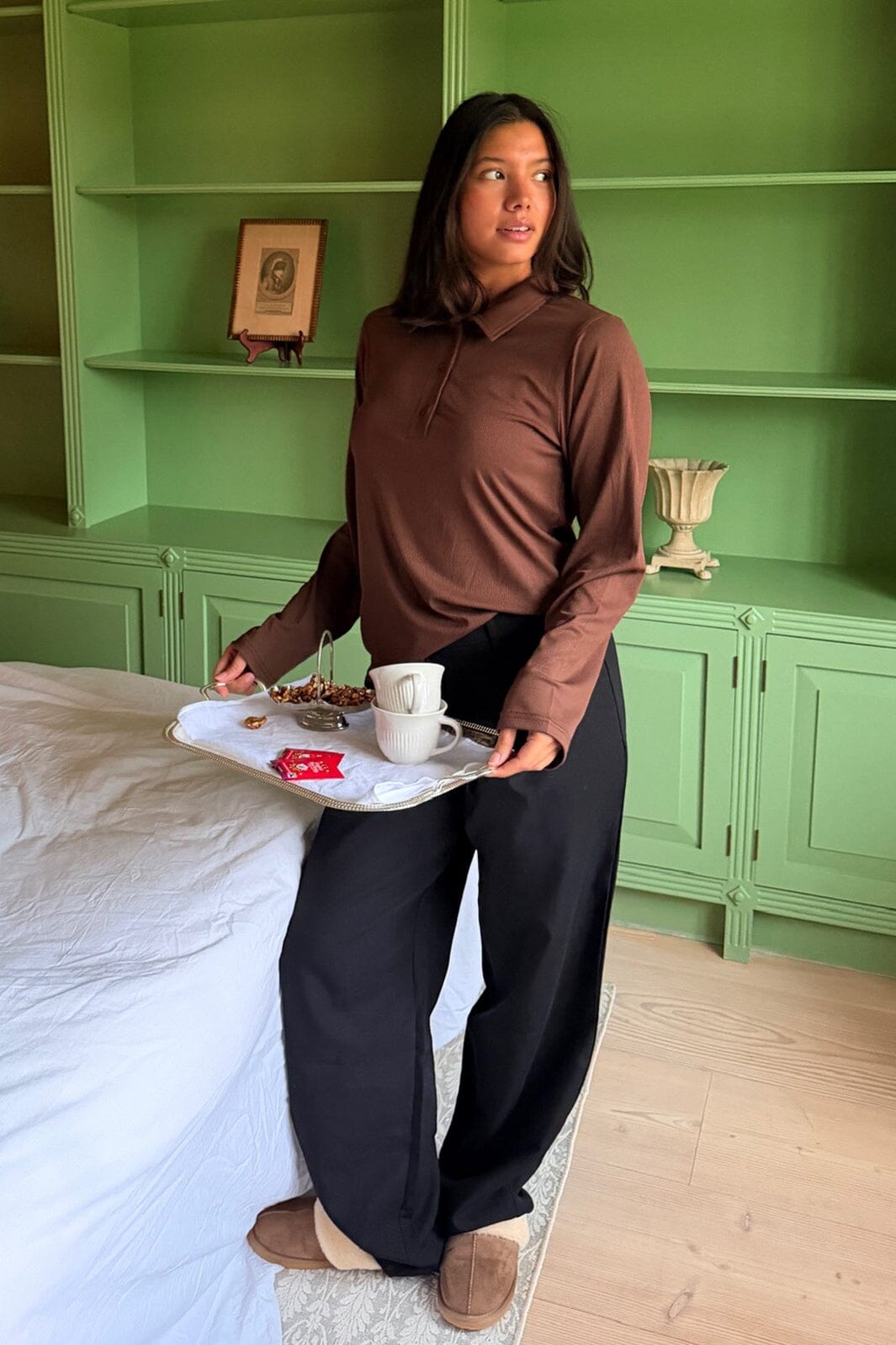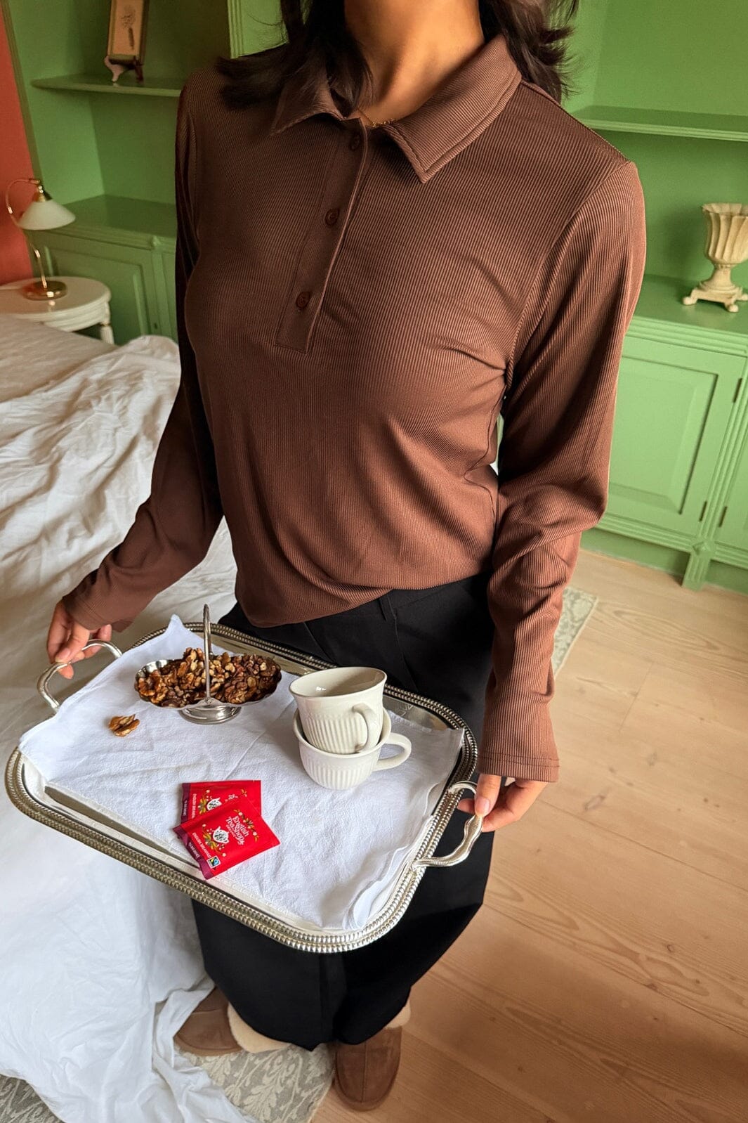 Un polo marron foncé de BYIC, fabriqué en tissu côtelé. Le polo a un col avec fermeture à boutons et des manches longues.